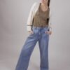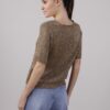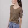 Maglia a maniche corte in lurex con costine su maniche e orlo e scollo a V.