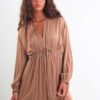 Ein langes Kleid mit V-Ausschnitt und langen Ärmeln, das sich durch eine fließende und elegante Linie auszeichnet. Der Kordelzug betont die Silhouette zart, während der geraffte Saum für Bewegung und einen romantischen Touch sorgt. Aus leichtem und bequemem Stoff gefertigt, eignet es sich perfekt für elegante Alltagsoutfits oder besondere Anlässe.