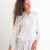 Ein weiches, klar geschnittenes Hemd aus fließender, leichter Viskose, ideal für natürliche Bewegungsfreiheit. Der klassische Kragen und die Knopfleiste vorne verleihen ihm einen klaren, vielseitigen Stil, perfekt für jeden Anlass. Die langen, leicht gerafften Ärmel setzen ein zartes, feminines Detail. Ein lässiges Kleidungsstück, perfekt zu Hosen oder Röcken für einen schlichten, raffinierten und zeitlosen Look.