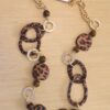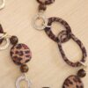 Eine lange Halskette mit markantem und glamourösem Design, bestehend aus runden Elementen mit Animalprint in Stoffoptik, glänzenden braunen Kugeln und gehämmerten Goldringen. Ein auffälliges und trendiges Accessoire, perfekt, um minimalistischen Looks einen modischen Touch zu verleihen oder Abendoutfits aufzuwerten. Ideal für alle, die originelle und auffällige Accessoires lieben.