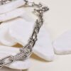Collana catena argento con dettagli in strass, gioiello moderno e deciso, ideale per arricchire outfit streetwear o urban chic. Struttura composta da maglie rettangolari con nodi decorativi e chiusura frontale con anello impreziosito da strass. Accessorio statement perfetto per boutique alla ricerca di bigiotteria contemporanea e versatile.