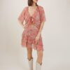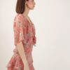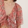 Blusa leggera in chiffon con stampa floreale all-over, caratterizzata da scollo a V profondo con doppi fiocchi e volant. maniche corte ampie e taglio cropped per un look fresco e romantico, ideale da abbinare a gonne o pantaloni a vita alta. perfetta per outfit primaverili e estivi.