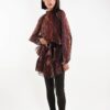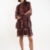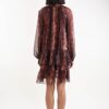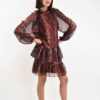Chiffonkleid mit Leopardenmuster, transparenten Ärmeln und gerafftem Kragen. Die ausgestellte Silhouette ist mit leichten Rüschen verziert, die für Bewegung und Weiblichkeit sorgen. Ein elegantes und trendiges Modell, perfekt für Boutiquen und Modegeschäfte, die raffinierte, vielseitige und moderne Kleider mit Leopardenmuster anbieten möchten – ideal für Tag und Abend.