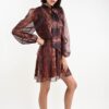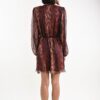 Kurzes Kleid aus leichtem Chiffon mit Leopardenmuster, langen transparenten Ärmeln, Schleife am Hals, verstärkten Trägern und elastischem Bund. Ein elegantes und raffiniertes Design, perfekt für Boutiquen und Modegeschäfte, die feminine und trendige Kleider suchen. Die lockere Taille betont die Figur und macht das Kleid ideal für Feiern, besondere Anlässe oder den Abend.