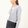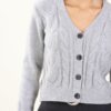 Cardigan lavorato a trecce, manica lunga, con scollo a V polsini e cannolè a costine, abbottonatura a quattro bottoni.