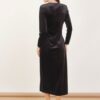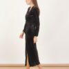 Abito lungo in velluto con drappeggio in vita, spacco e spalline imbottite.