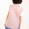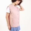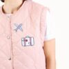 Gilet trapuntato in tessuto leggero con lavorazione a rombi e applicazioni ricamate a tema viaggio. Chiusura a bottoni metallici e tasche laterali a filetto.