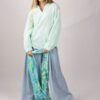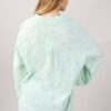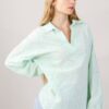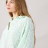Blusa a maniche lunghe scollo a V in sangallo, con elastico alla manica. Colletto classico.