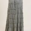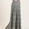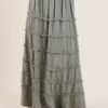 Gonna lunga a balze, realizzata in morbido cotone effetto stropicciato. Il design è arricchito da dettagli sfrangiati applicati tra una balza e l’altra, che donano movimento e carattere al capo. La vita è elasticizzata per garantire comfort e vestibilità versatile, perfetta da indossare sia con top basic che con bluse ampie. Ideale per completare look estivi dallo stile naturale e sofisticato.