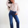 Feminine und raffinierte Viskosebluse, perfekt für Büro-Looks oder formelle Outfits. Das Design besticht durch einen eleganten Ausschnitt mit Schleife zum Binden und romantische Rüschen auf der Vorderseite, die das Dekolleté betonen. Lange Ärmel mit gerafften Bündchen verleihen einen raffinierten Touch. Ein vielseitiges Modell, ideal zu eleganten Hosen oder hoch taillierten Röcken für zeitlose Eleganz.