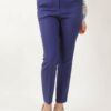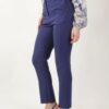 Pantaloni eleganti a vita alta con chiusura frontale a bottone e zip nascosta, accompagnata da passanti per la cintura. La linea dei pantaloni è dritta e leggermente affusolata, valorizzando la figura con una vestibilità aderente ma confortevole. Le pieghe centrali lungo la gamba donano un aspetto sartoriale e sofisticato. La lunghezza termina alla caviglia.