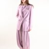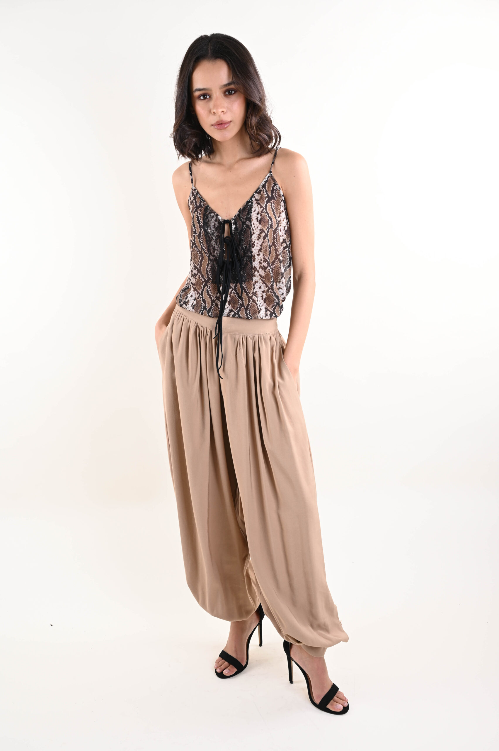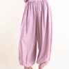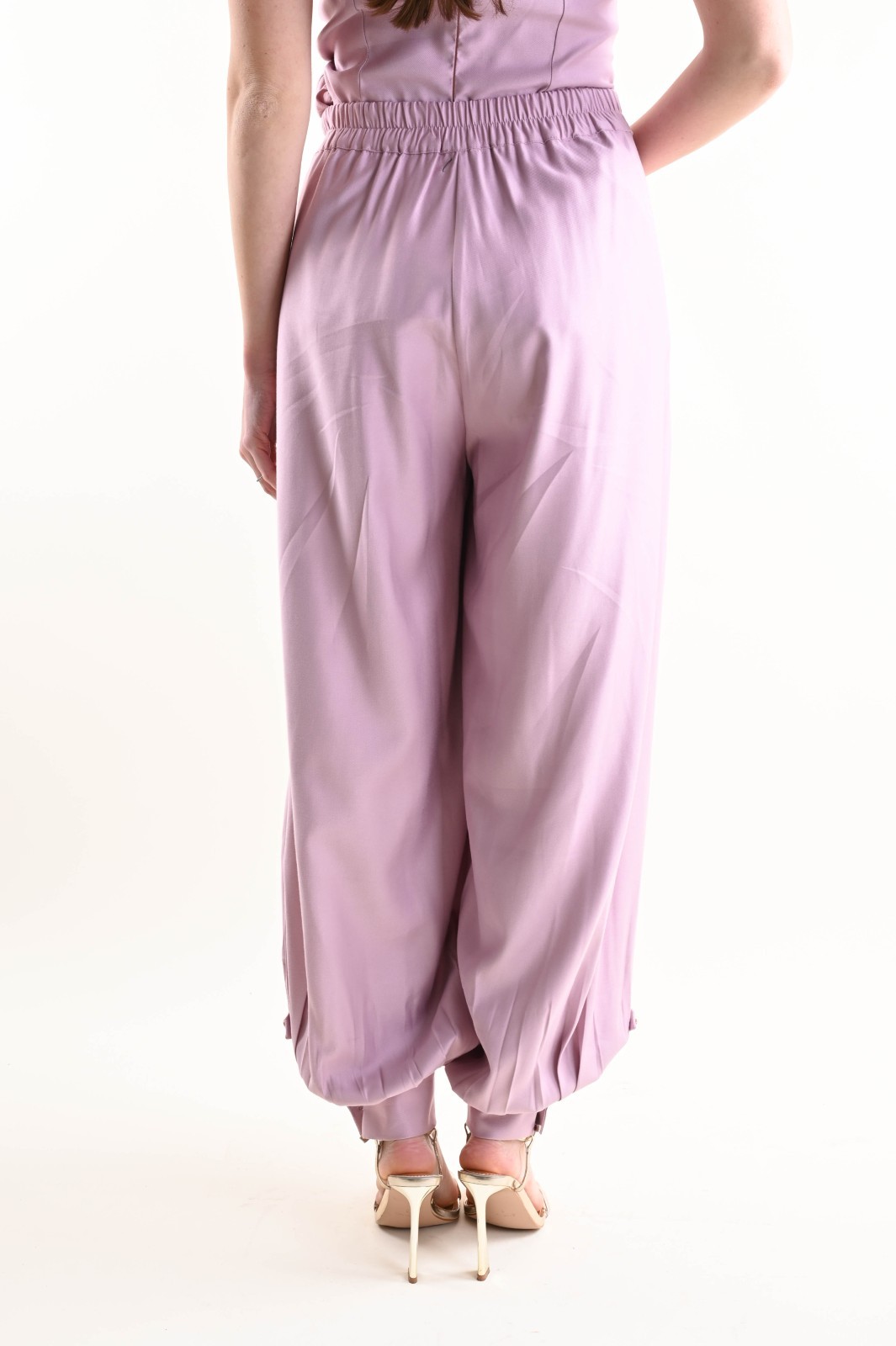 Il volume morbido sulle gambe crea un effetto sofisticato e contemporaneo, mentre il fondo arricciato con dettaglio al polsino aggiunge personalità al capo, rendendolo distintivo e ricercato. Il tessuto scivolato accompagna il movimento con naturalezza, assicurando comfort durante tutta la giornata.