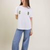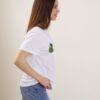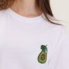 T-shirt con avocado in strass realizzata in morbido cotone. Il capo presenta due applicazioni a forma di avocado, ricamate con cristalli verdi, oro e marroni, posizionate simmetricamente sul petto. Un dettaglio