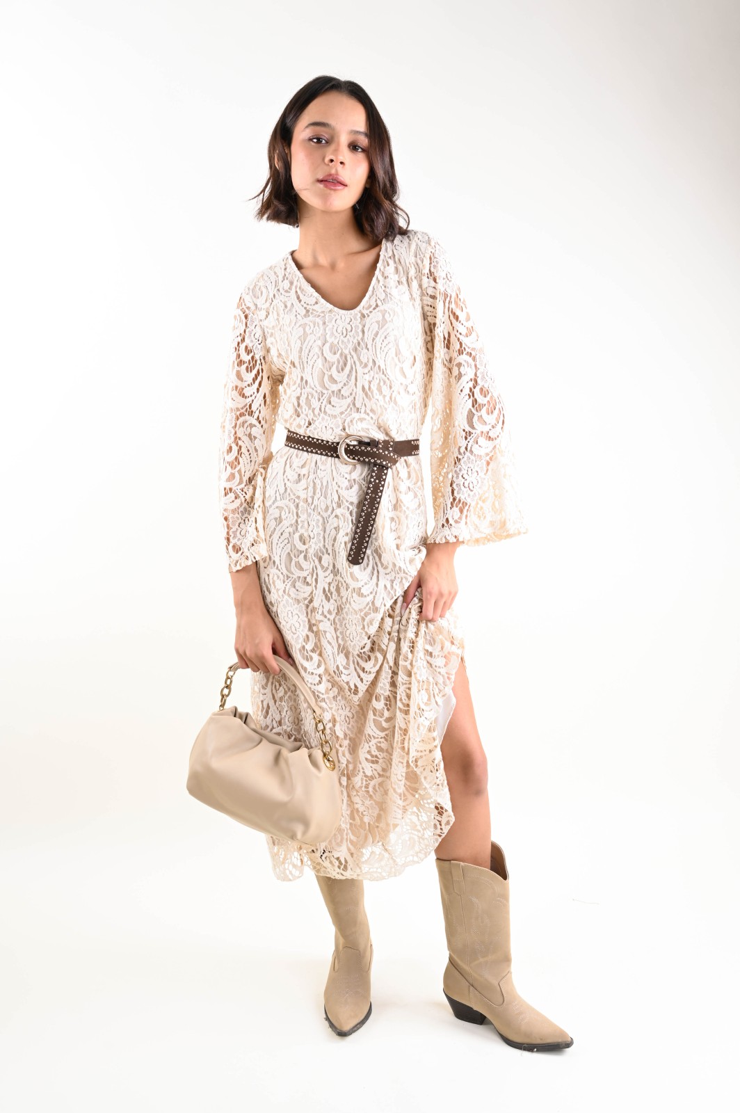 ABITO LUNGO IN PIZZO CON SCOLLO A V - Κρέμα, S/M