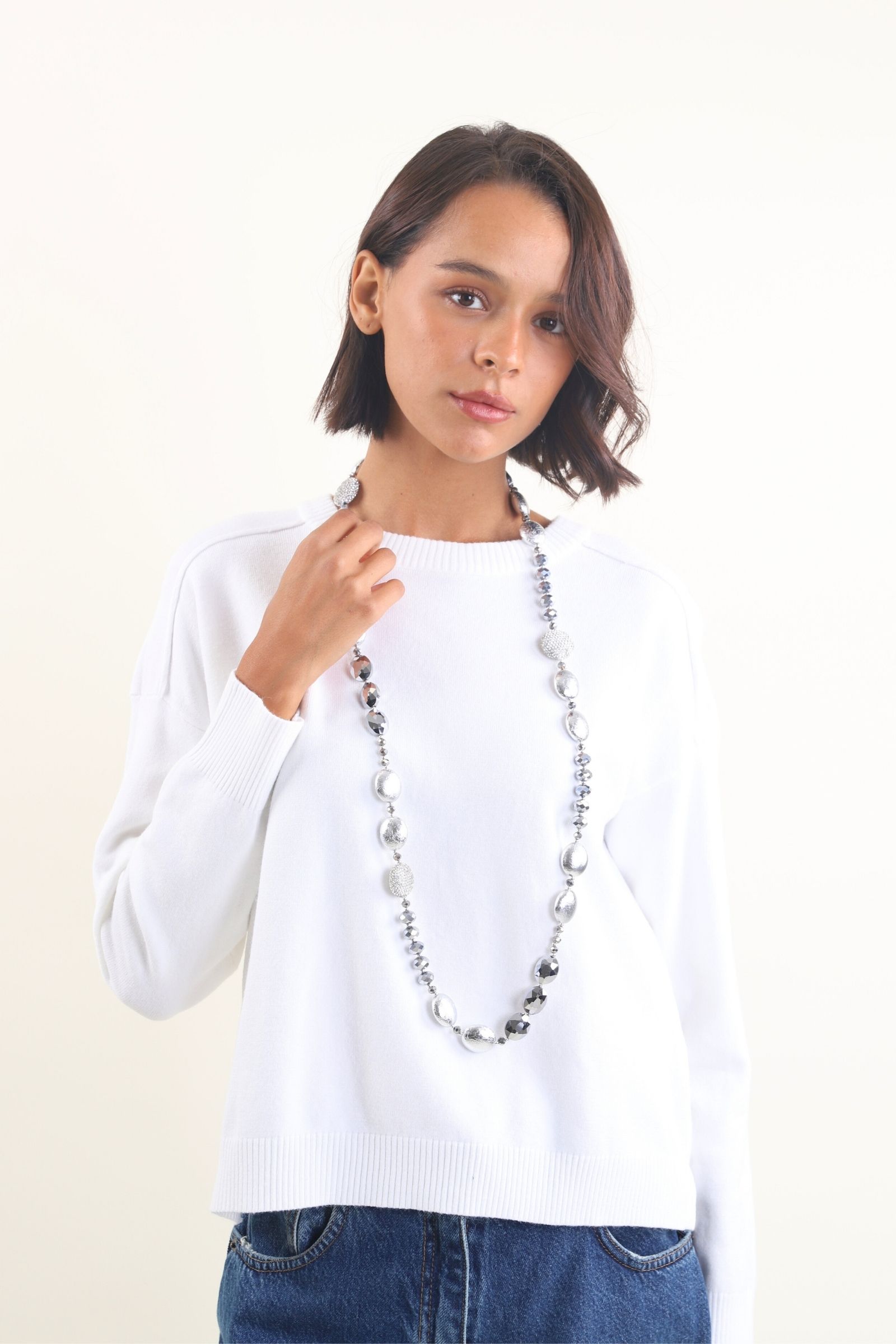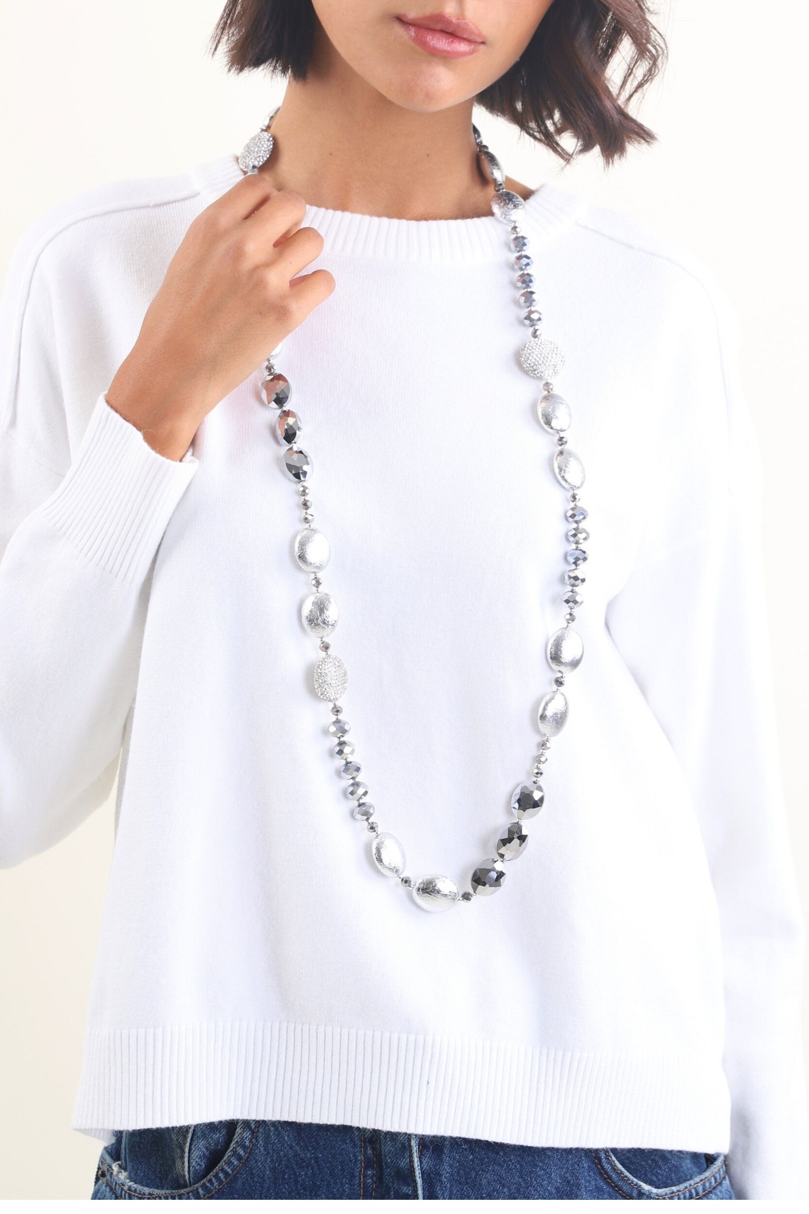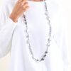 Μακρύ κολιέ με εκλεπτυσμένο σχέδιο, με χρυσά μαργαριτάρια με σατινέ φινίρισμα, πολυεδρικά καφέ κρύσταλλα και λαμπερές σφαίρες pavé. Ένα κομψό και ευέλικτο αξεσουάρ, ιδανικό για να αναδείξετε τα ημερήσια και βραδινά σύνολα με μια πινελιά λάμψης και στυλ. Φοριέται τέλεια ως μονό κολιέ ή διπλό για ένα πιο εκλεπτυσμένο αποτέλεσμα.