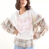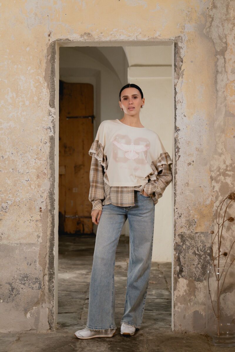 Γυναικείο πουλόβερ με πρωτότυπο σχέδιο, σχεδιασμένο για όσους αγαπούν τα ξεχωριστά κομμάτια. Το μοντέλο διαθέτει κλασική στρογγυλή λαιμόκοψη και χαλαρή εφαρμογή. Το μπροστινό τύπωμα προσθέτει χαρακτήρα και προσωπικότητα, ενώ τα μανίκια του πουκαμίσου με δαντέλα προσθέτουν μια ρομαντική πινελιά.