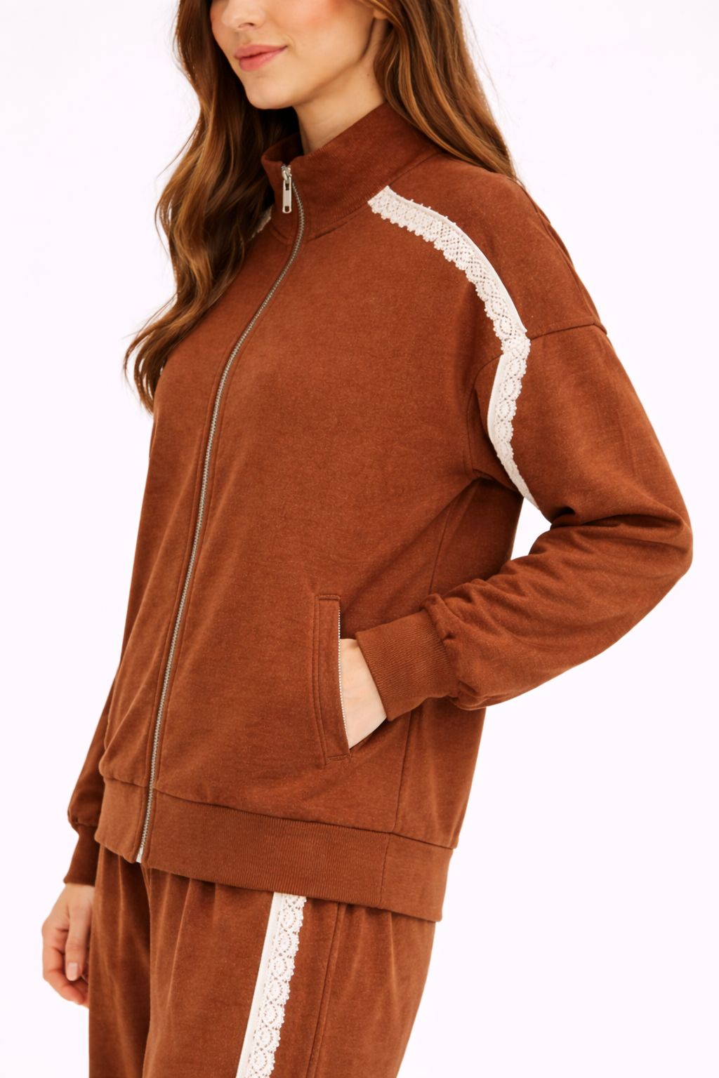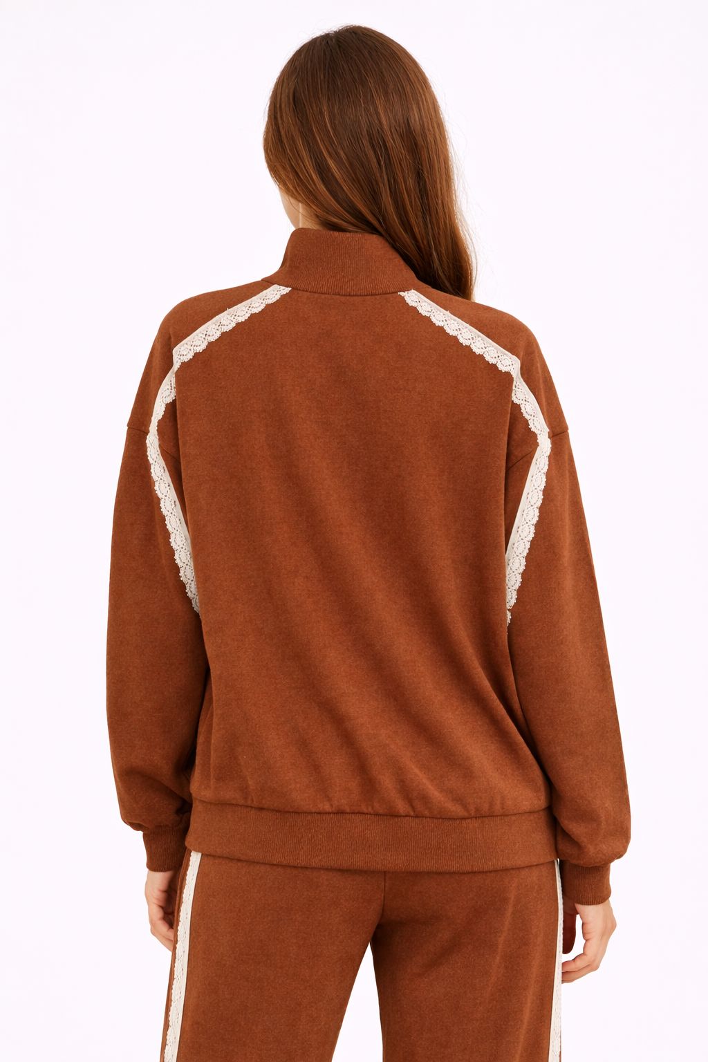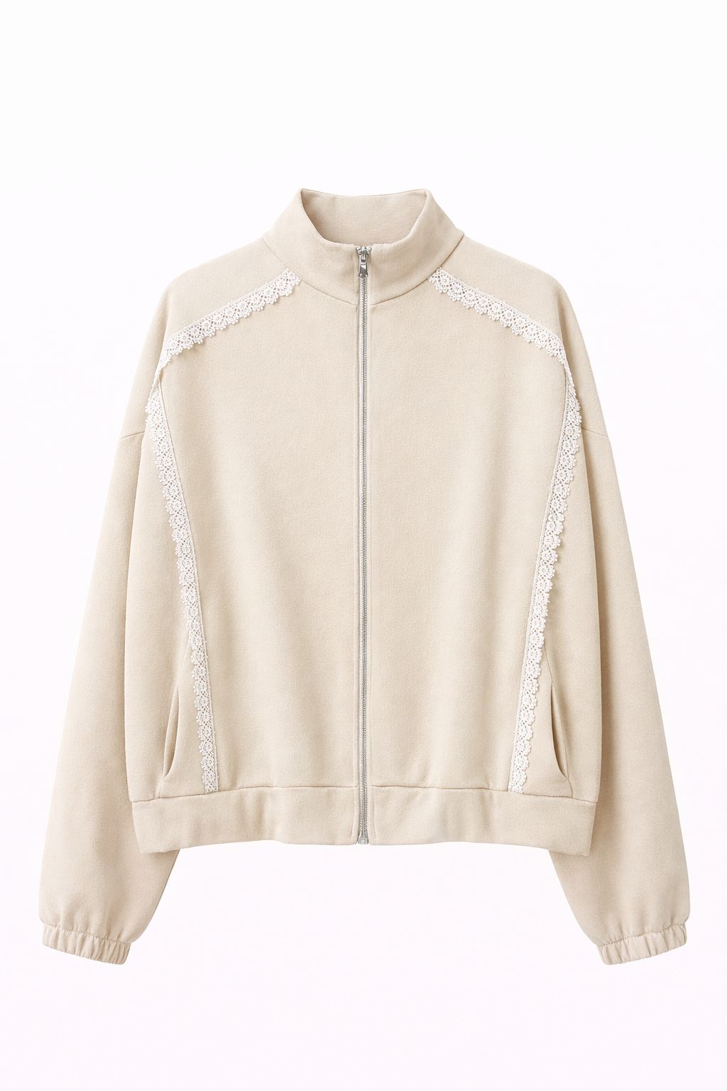Φούτερ με φερμουάρ σε όλο το μήκος, χαλαρή εφαρμογή, ψηλό λαιμό και χαμηλωμένους ώμους. Το σχέδιο ενισχύεται από δαντελένια ένθετα που ορίζουν το μπροστινό μέρος και τα μανίκια, δημιουργώντας μια θηλυκή και μοντέρνα αντίθεση. Ελαστικό στρίφωμα και μανσέτες για άνετη εφαρμογή. Ιδανικό με ασορτί παντελόνι ή μια casual-chic εμφάνιση.