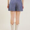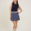 Gonna pantalone in denim scuro, caratterizzata da una silhouette svasata, con pieghe leggere. Arricchita da passanti per cintura.