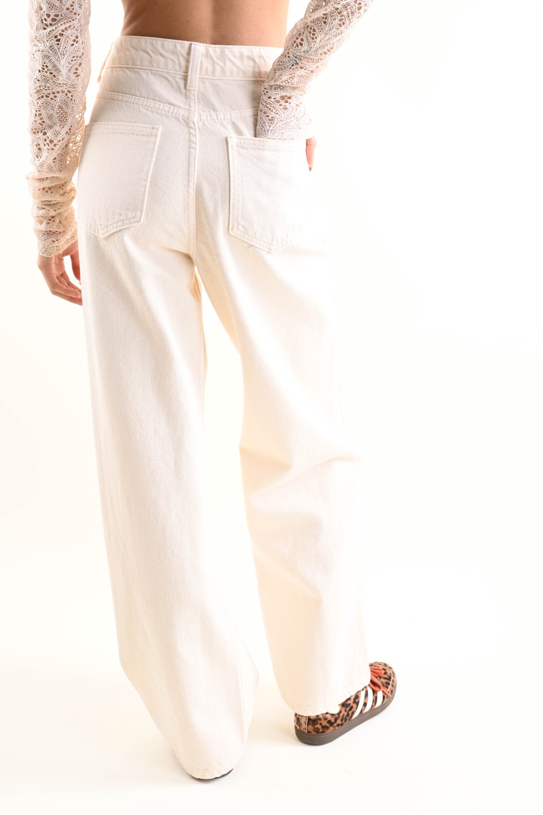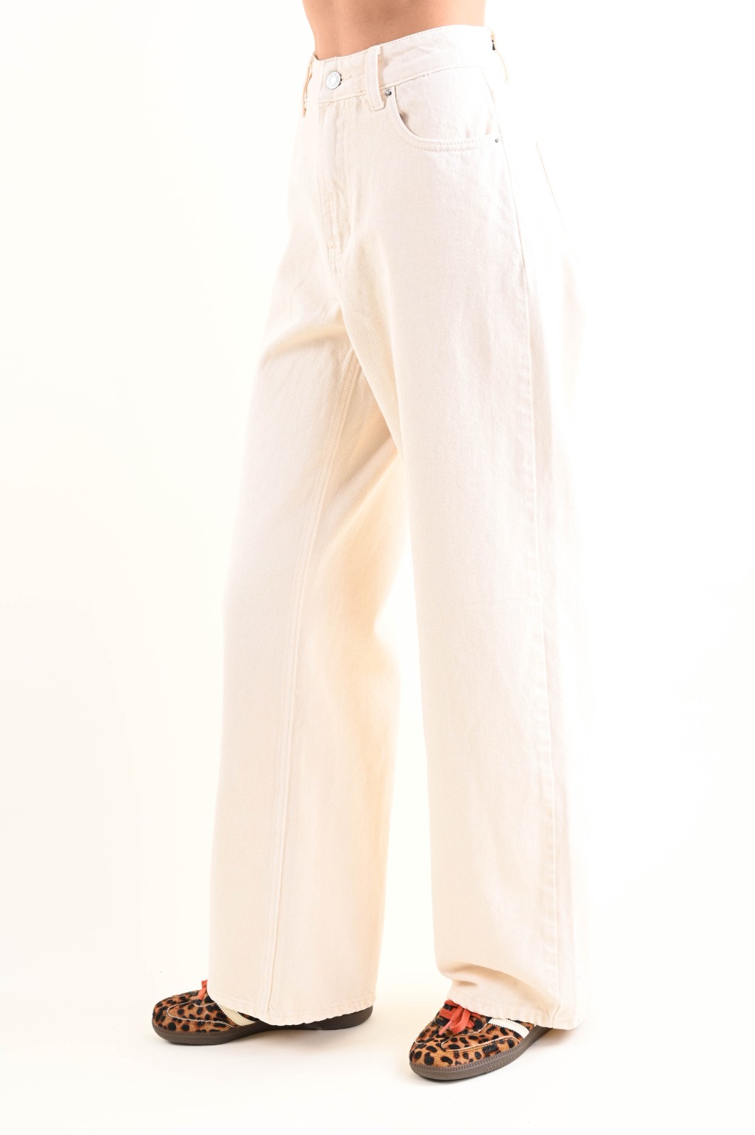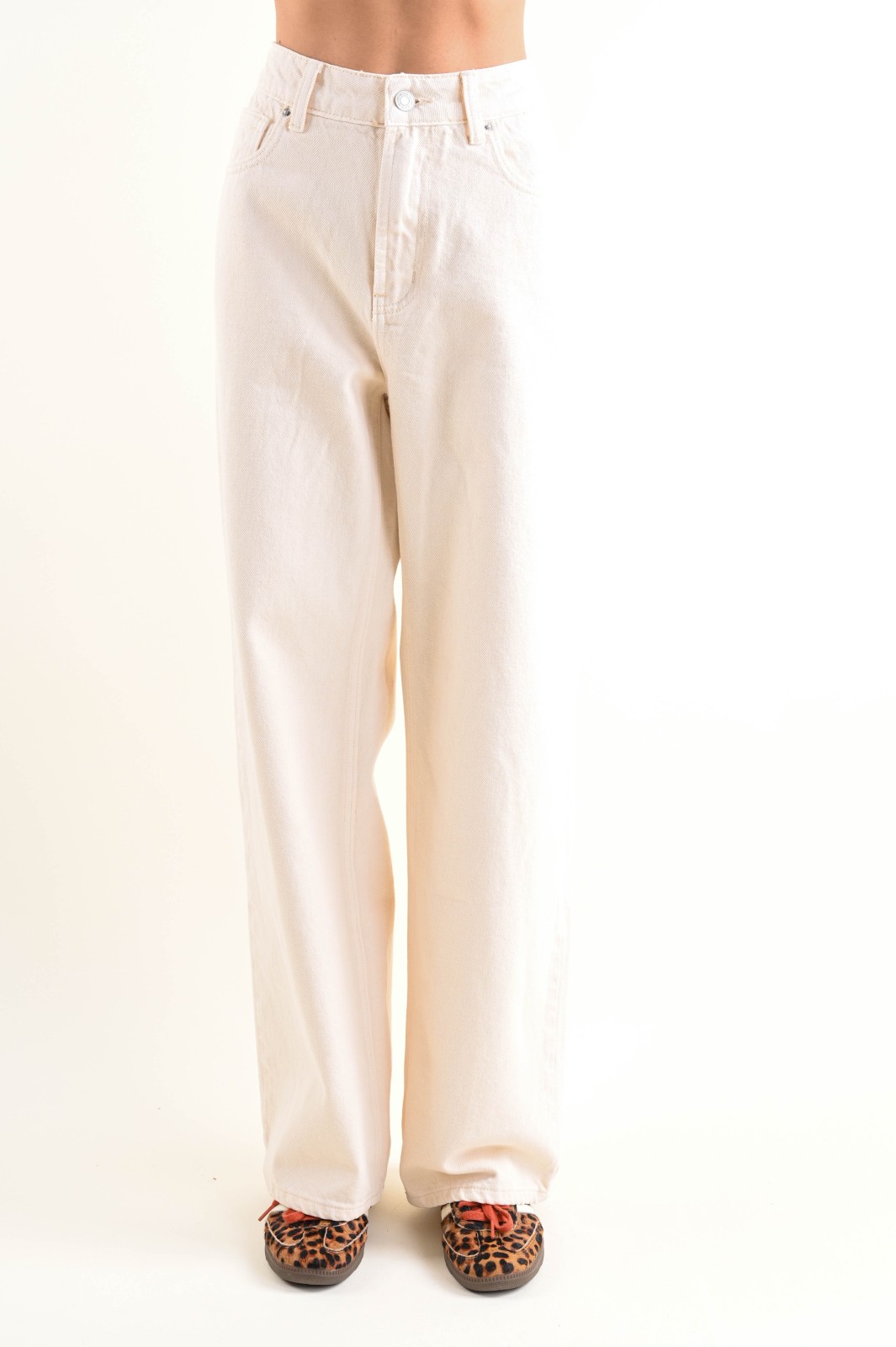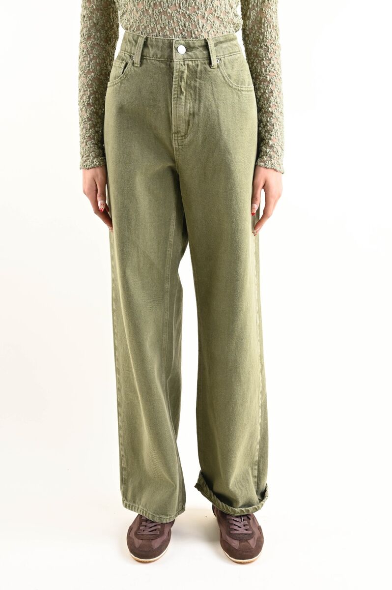 Παντελόνι τζιν με καθαρή, ίσια εφαρμογή, με φαρδύ μπατζάκι που πέφτει χαλαρά μέχρι το στρίφωμα.