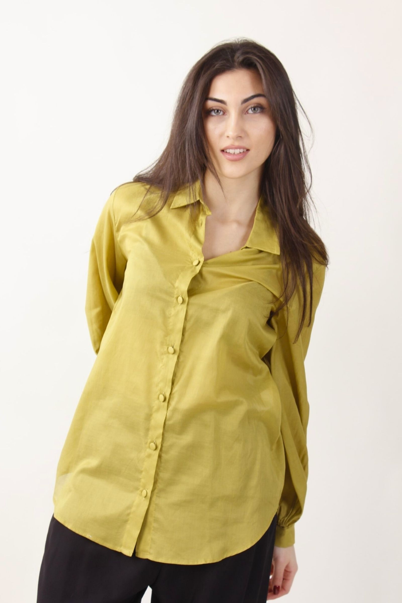 Κομψό πουκάμισο σε ρευστή κοπή από ελαφρύ, λαμπερό ύφασμα. Διαθέτει κλασικό γιακά και κλείσιμο μπροστά με κουμπιά τόνου σε τόνο. Τα μακριά μανίκια είναι φαρδιά και ελαφρώς φουσκωμένα, σφιγμένα στις μανσέτες. Το στρίφωμα του πουκαμίσου είναι ελαφρώς στρογγυλεμένο.