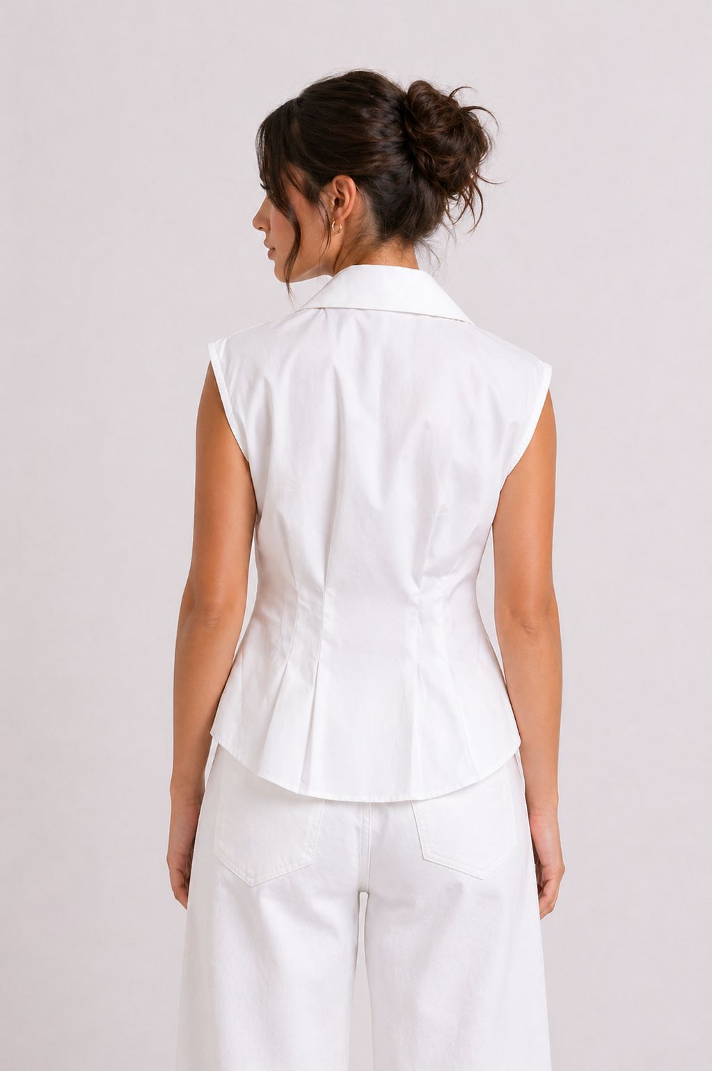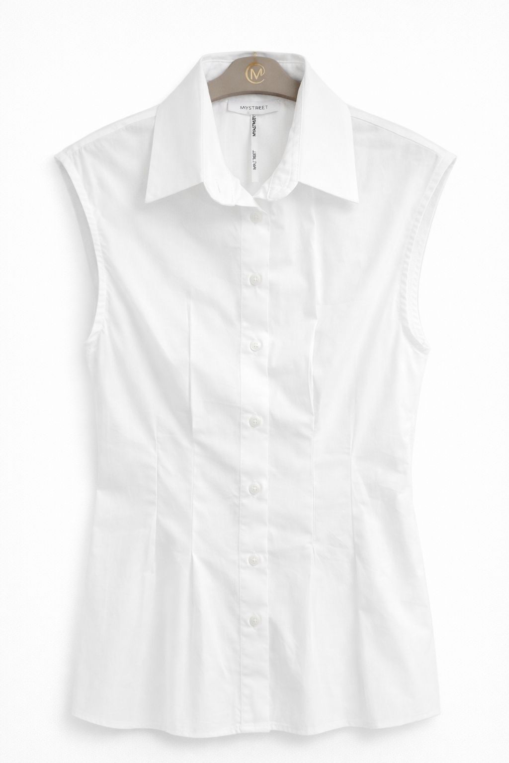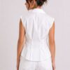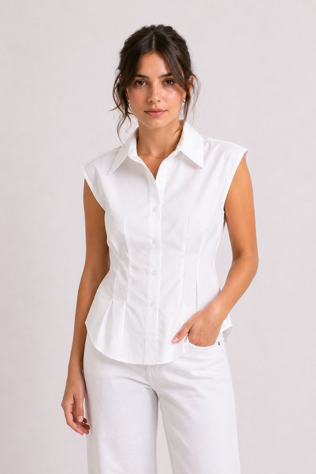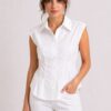 Ένα εκλεπτυσμένο και θηλυκό γυναικείο αμάνικο πουκάμισο, διακοσμημένο με κομψές πιέτες μπροστά που προσθέτουν κίνηση και κολακεύουν τη σιλουέτα. Κατασκευασμένο από ελαφρύ και άνετο ύφασμα, είναι ιδανικό για την άνοιξη-καλοκαίρι και ιδανικό για να αντιμετωπίσετε την ημέρα με στυλ. Ευέλικτο και εύκολο στο συνδυασμό, προσφέρεται τόσο για casual όσο και για εκλεπτυσμένες εμφανίσεις, φορεμένο με παντελόνια, φούστες ή τζιν. Απαραίτητο για μια μοντέρνα και εκλεπτυσμένη γκαρνταρόμπα.