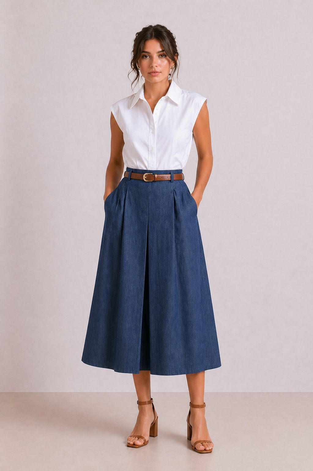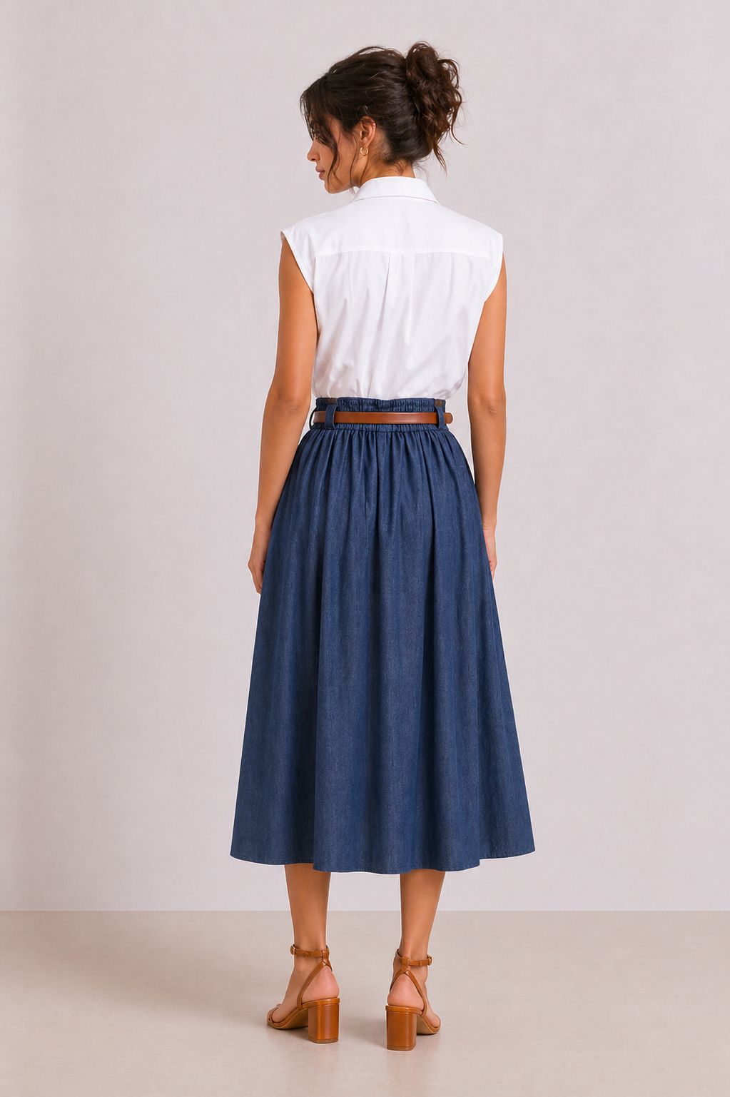 Ανακαλύψτε την πλισέ τζιν φούστα με ζώνη, απαραίτητη για μια μοντέρνα και δυναμική εμφάνιση. Κατασκευασμένη από τζιν υψηλής ποιότητας, αυτή η φούστα συνδυάζει ανθεκτικότητα και άνεση, προσαρμόζοντας τέλεια σε κάθε εποχή. Το πλισέ σχέδιο προσθέτει κίνηση και θηλυκότητα, ενώ η ζώνη στη μέση τονίζει τη σιλουέτα, προσφέροντας ρυθμιζόμενη και εκλεπτυσμένη εφαρμογή.