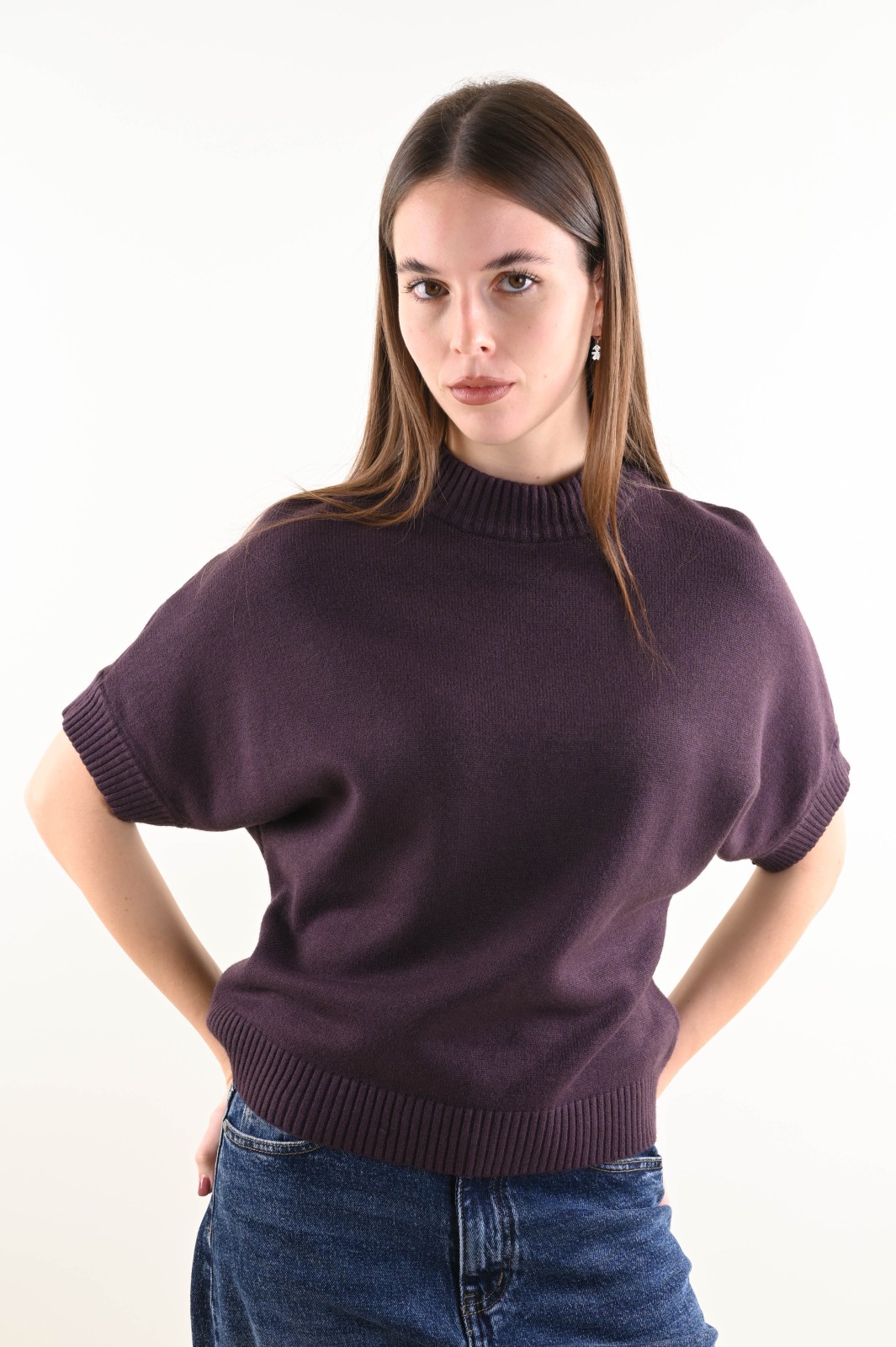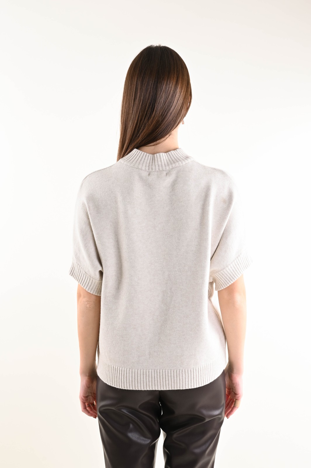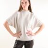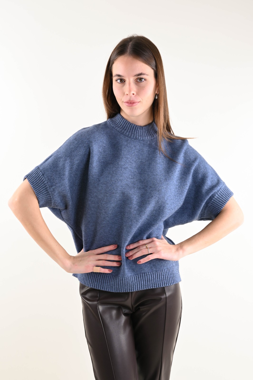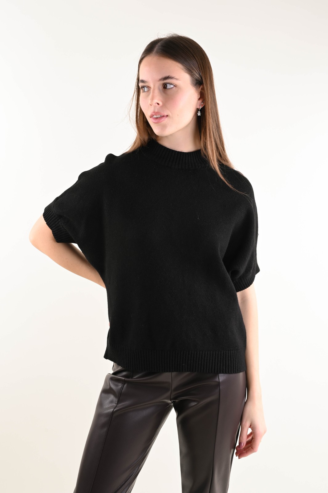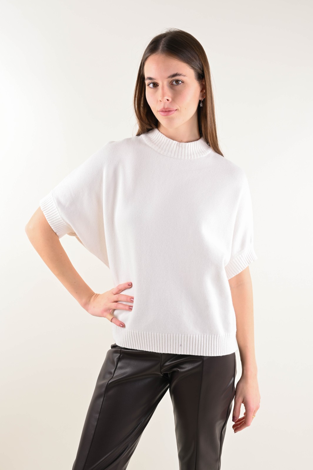 Short-sleeved batwing sweater and a ribbed neckline. A feminine and contemporary piece, perfect for adding a refined touch to seasonal looks. Its soft fit and clean design make it ideal to pair with jeans or trousers for an elegant yet effortless outfit.