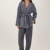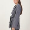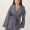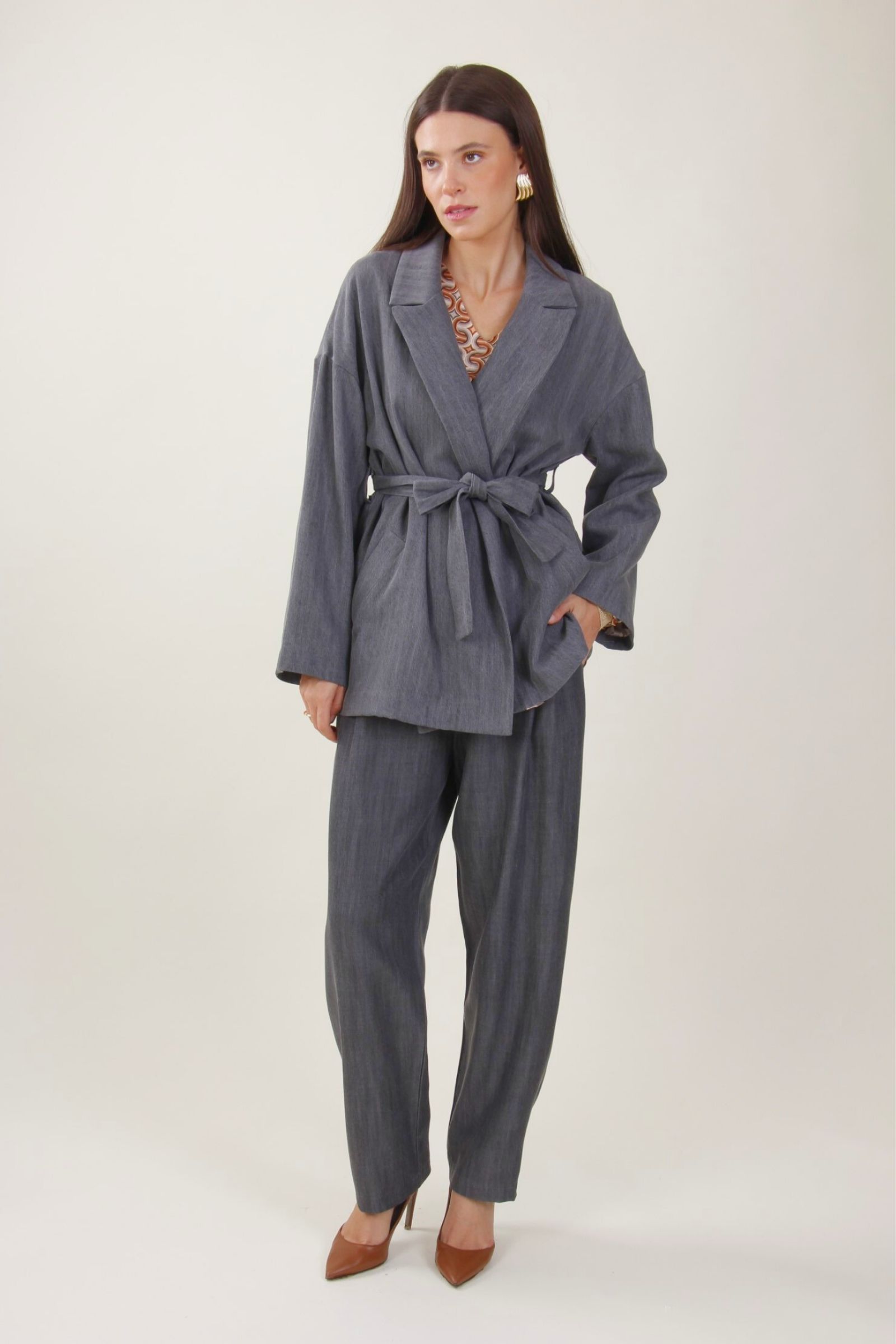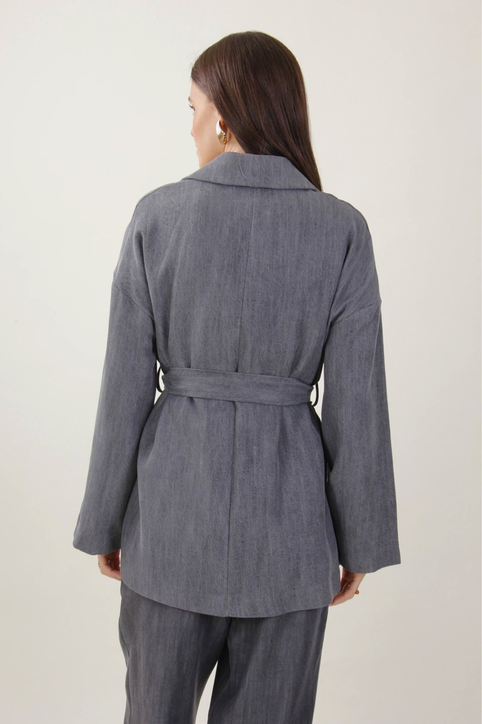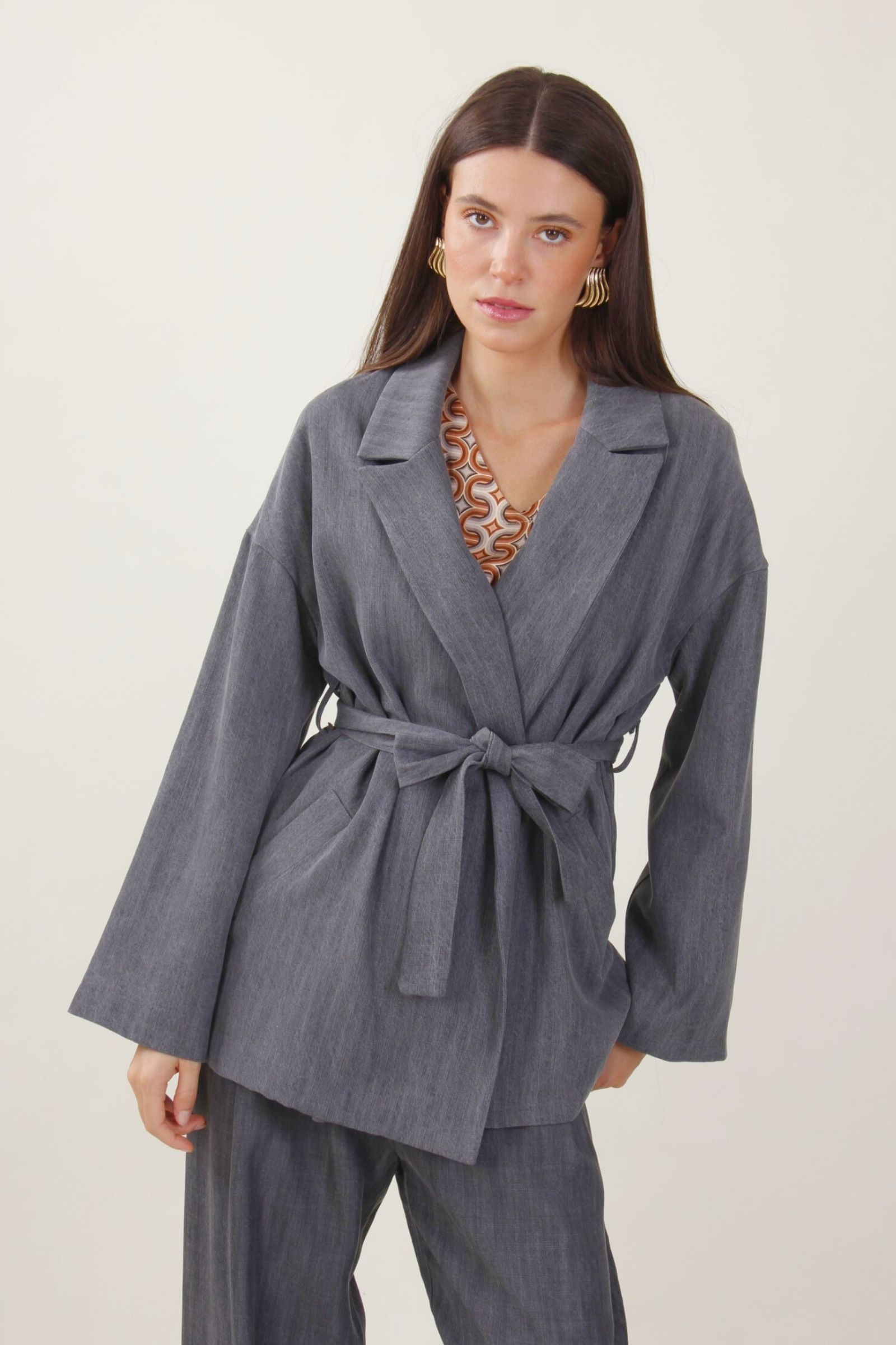Kimono jacket with contrasting patterned lining, side pockets, removable fabric belt.