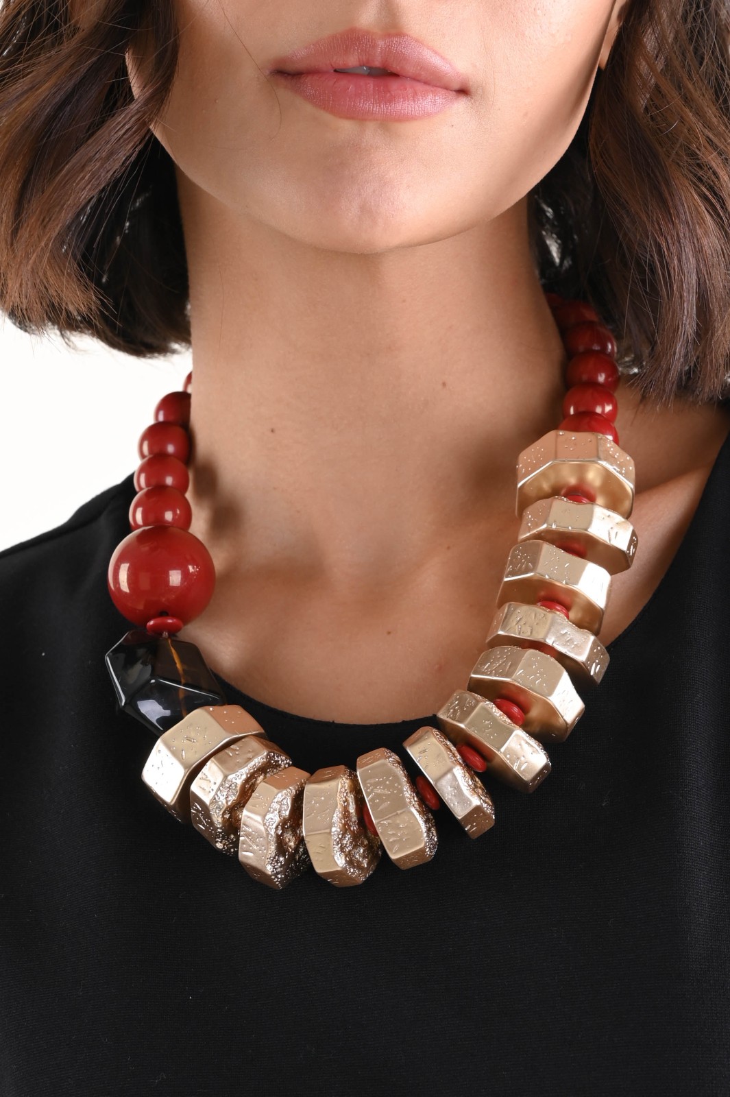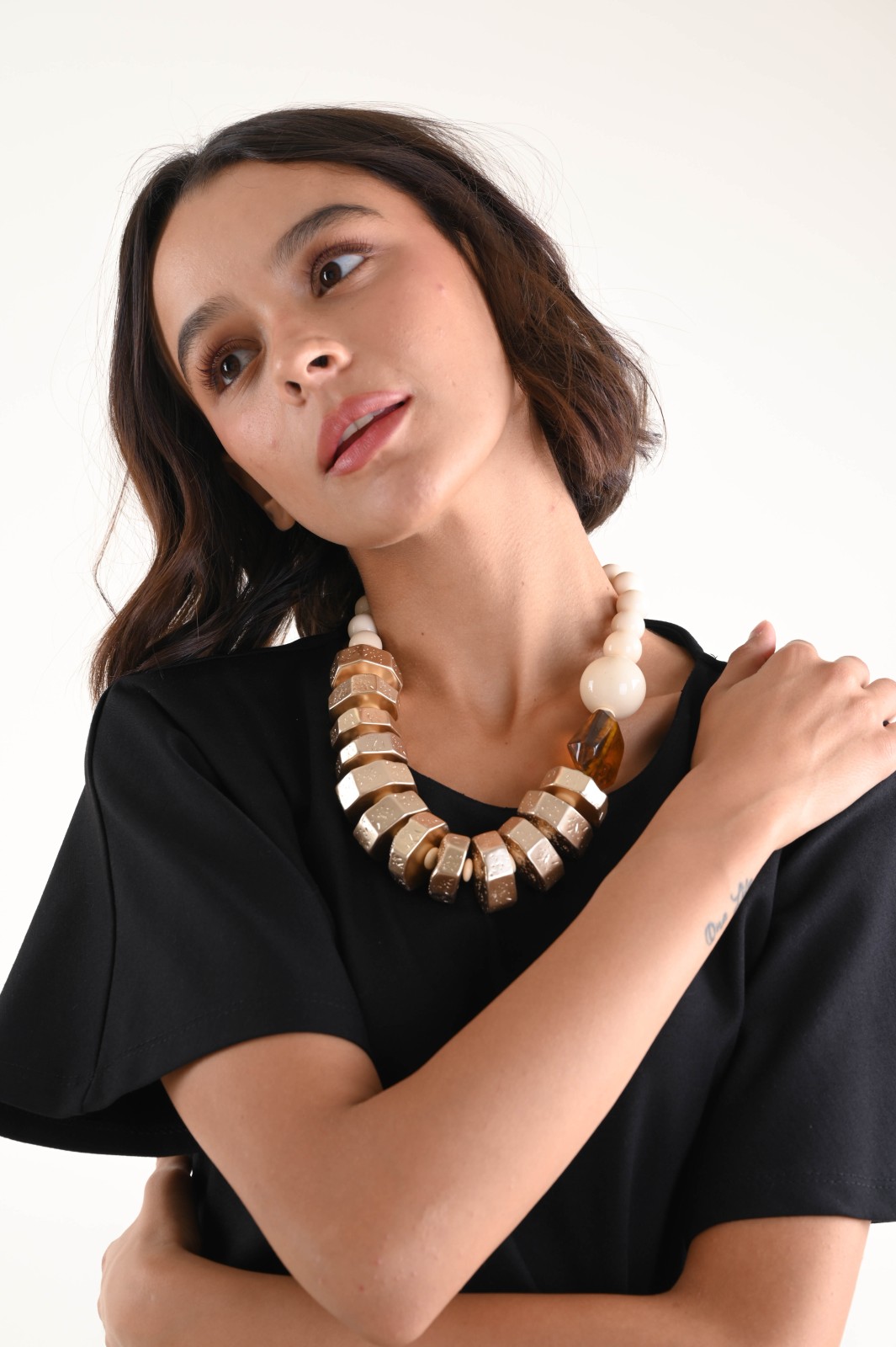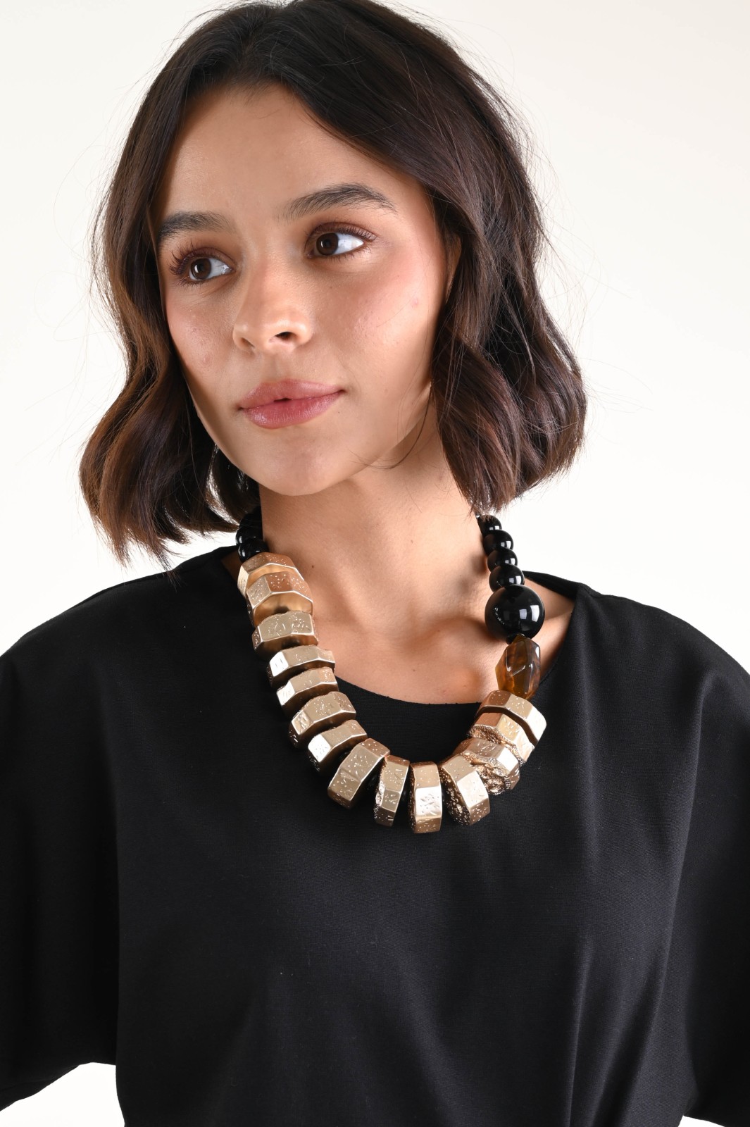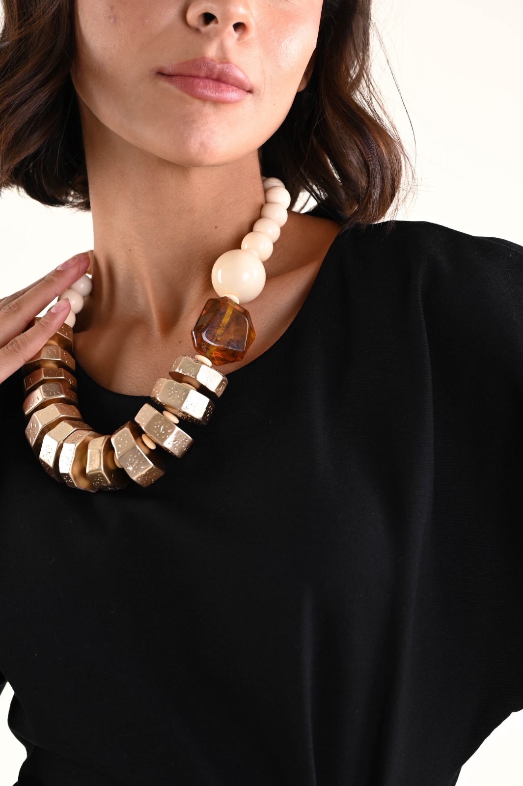 Bold costume jewelry necklace featuring hammered geometric pieces and oversized beads, designed to create a sculptural and contemporary effect. Ideal for boutiques looking for impactful accessories that elevate minimal outfits or add personality to more refined looks. Its voluminous structure and glossy details make it perfect for displays that aim to stand out.