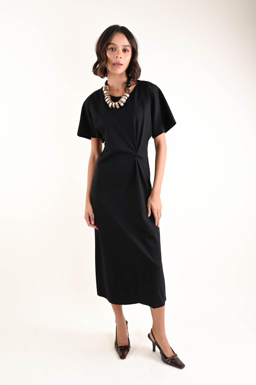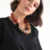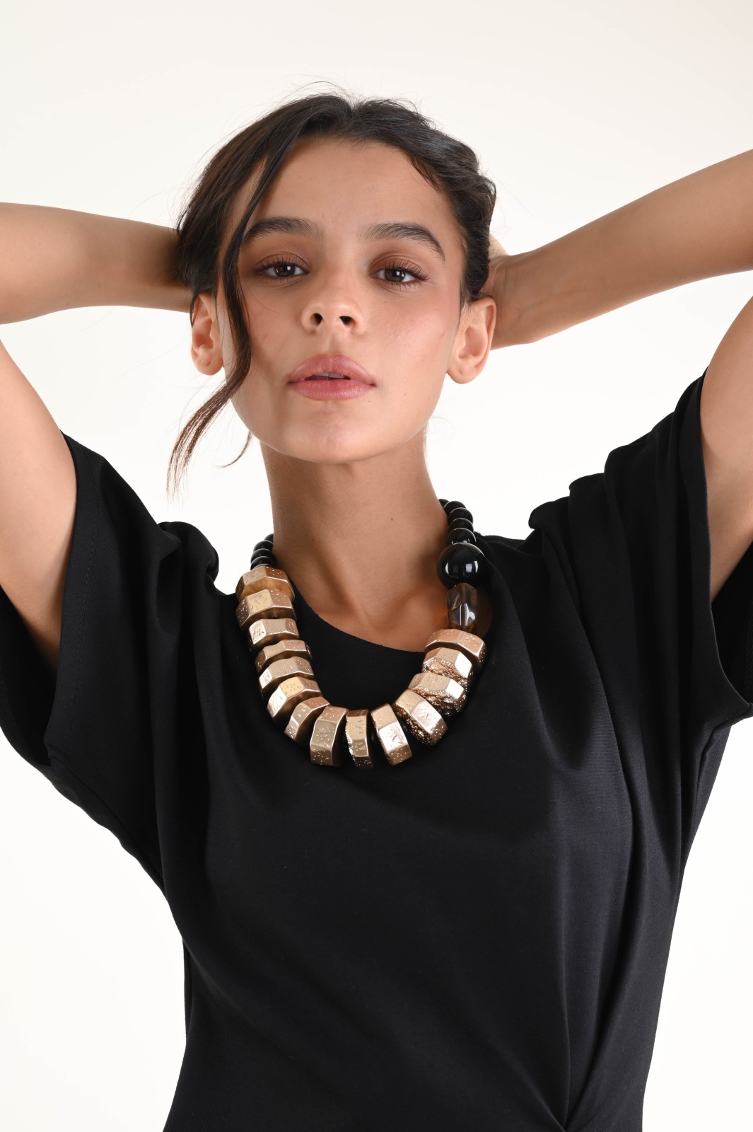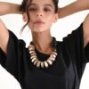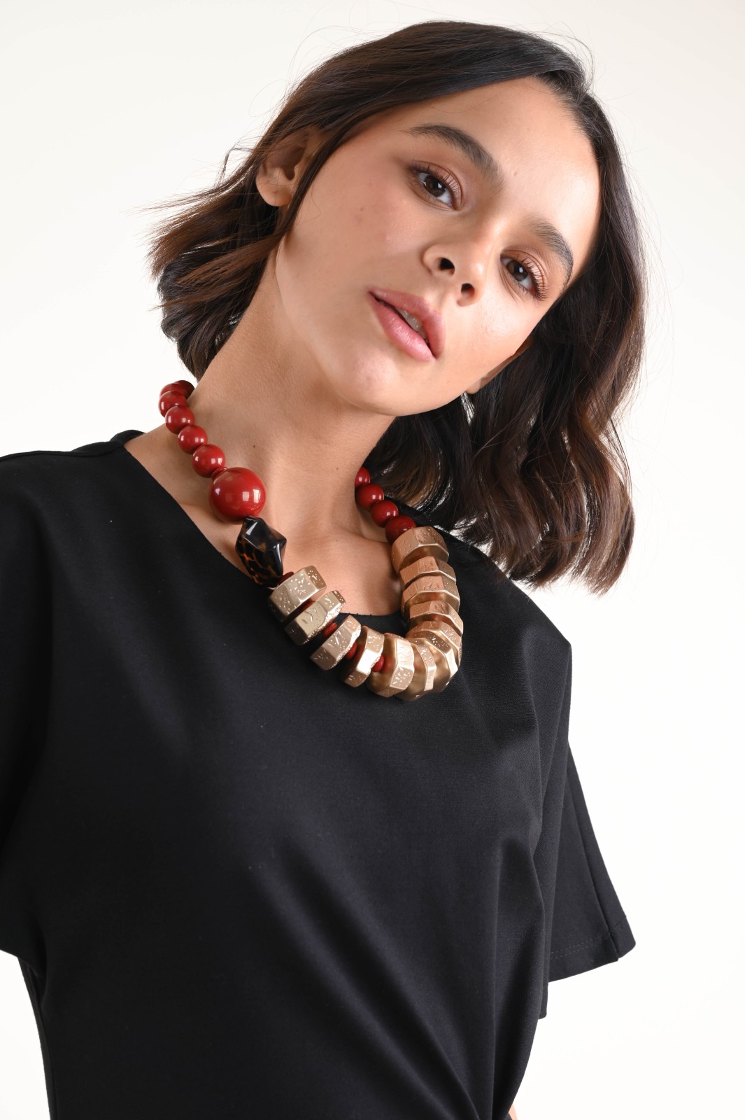 Bold costume jewelry necklace featuring hammered geometric pieces and oversized beads, designed to create a sculptural and contemporary effect. Ideal for boutiques looking for impactful accessories that elevate minimal outfits or add personality to more refined looks. Its voluminous structure and glossy details make it perfect for displays that aim to stand out.