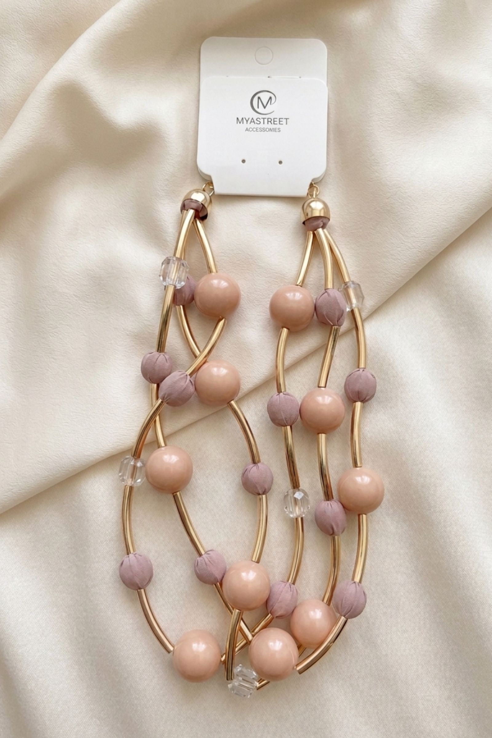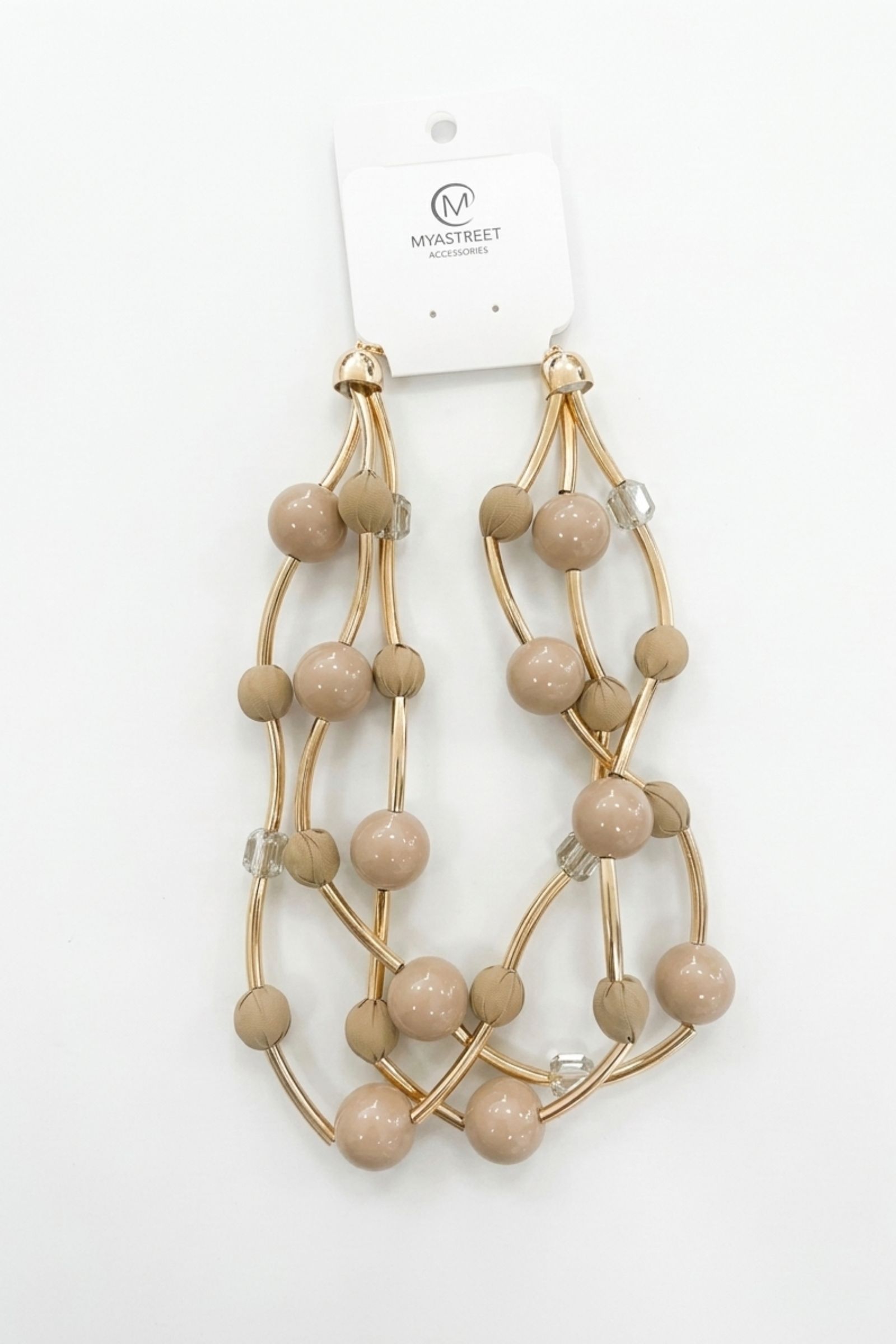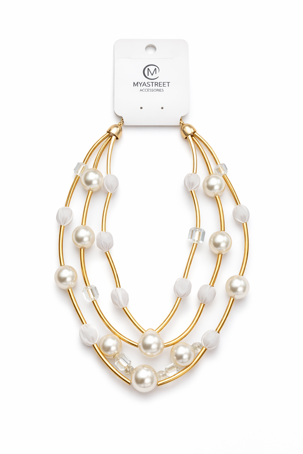 The irregular arrangement of the strands creates a dynamic and harmonious texture, enhancing the movement of the necklace when worn. The different decorative elements contribute to creating a bright and refined effect.