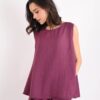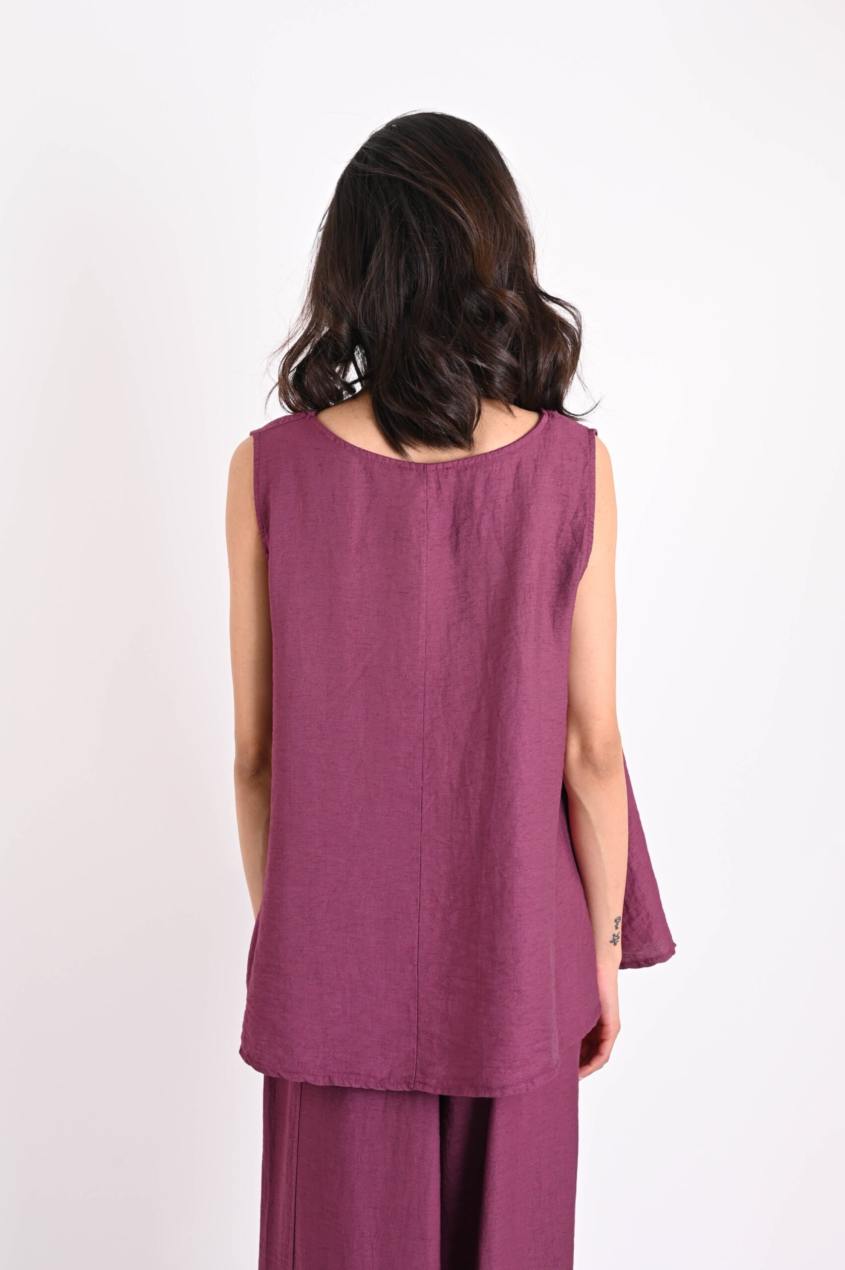 Sleeveless linen-blend top, ideal for a light and contemporary summer offering. Crafted from a fresh, breathable fabric, this piece combines comfort and style, making it perfect for the season with both elegance and practicality.