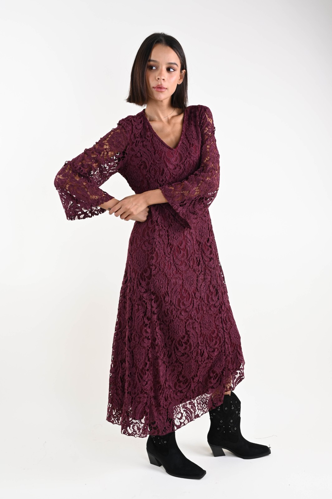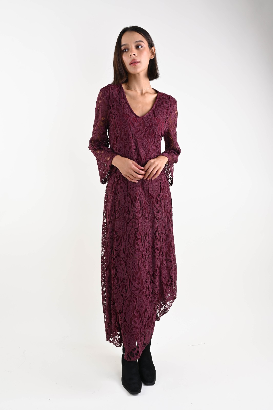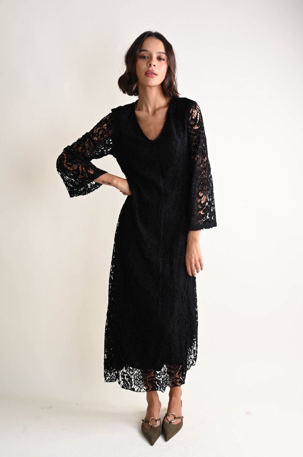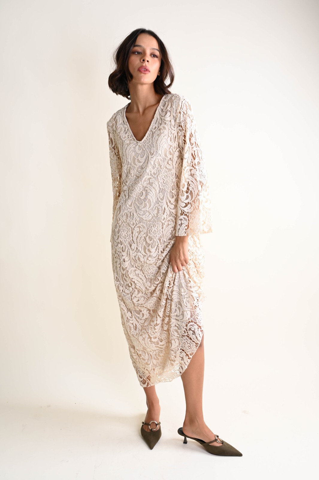 The long lace dress with a V-neckline by Myastreet embodies the brand’s signature refinement and femininity. Its flowing silhouette enhances the figure, while the deep V-neck adds a sensual yet sophisticated touch. The floral lace texture creates movement and lightness, making it perfect for ceremonies, events, or special evenings.