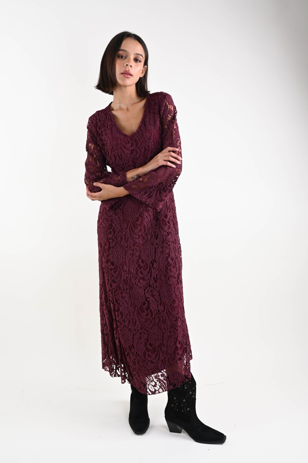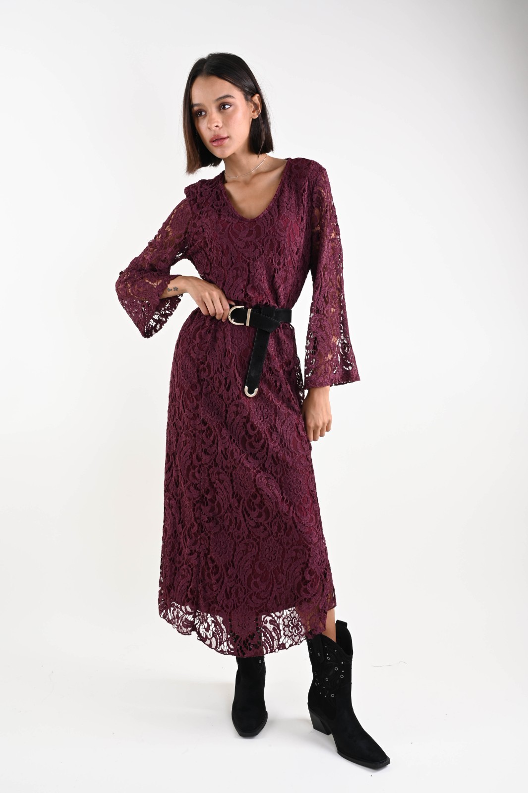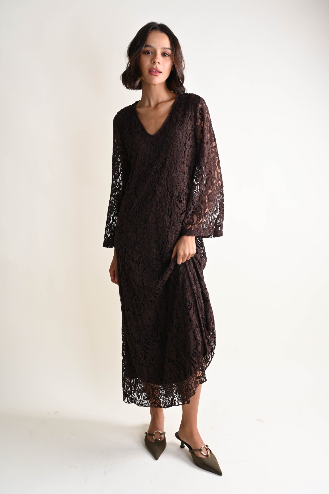 The long lace dress with a V-neckline by Myastreet embodies the brand’s signature refinement and femininity. Its flowing silhouette enhances the figure, while the deep V-neck adds a sensual yet sophisticated touch. The floral lace texture creates movement and lightness, making it perfect for ceremonies, events, or special evenings.