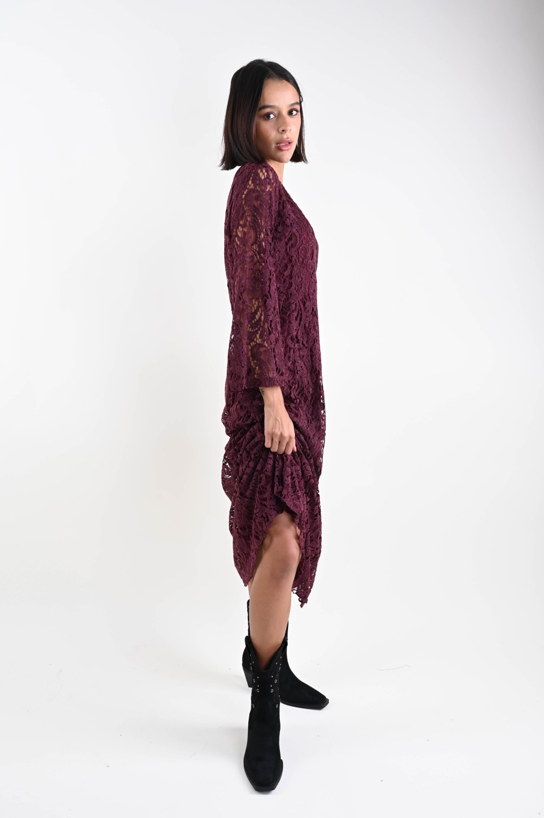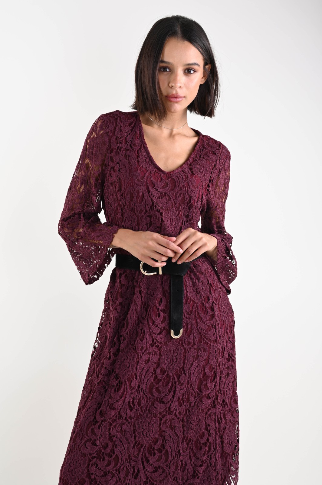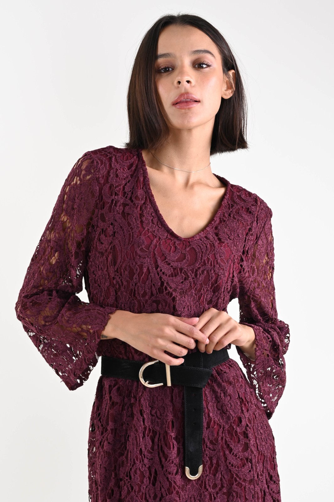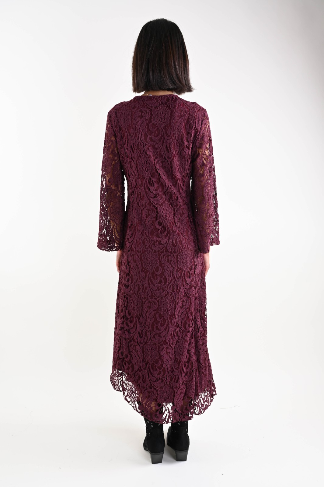 The long lace dress with a V-neckline by Myastreet embodies the brand’s signature refinement and femininity. Its flowing silhouette enhances the figure, while the deep V-neck adds a sensual yet sophisticated touch. The floral lace texture creates movement and lightness, making it perfect for ceremonies, events, or special evenings.