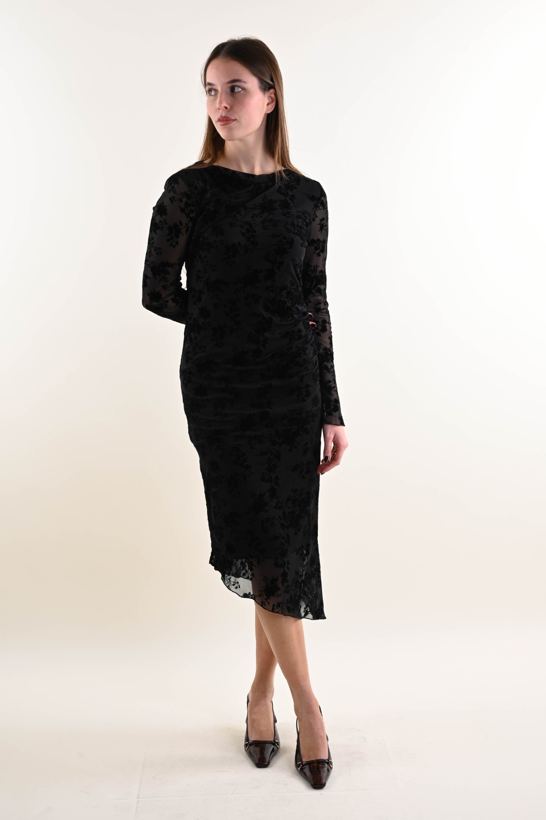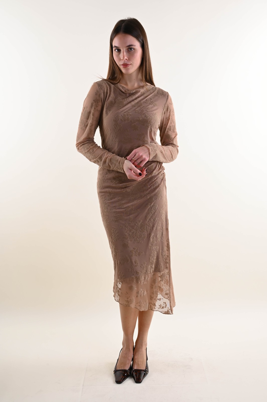 Long jacquard tulle dress featuring a delicate raised floral pattern and a refined side draping that enhances the silhouette. Designed with long sleeves and a lightweight texture, this piece is perfect for special occasions and elegant events. A must-have item for boutiques looking to offer a sophisticated and versatile style to their customers.