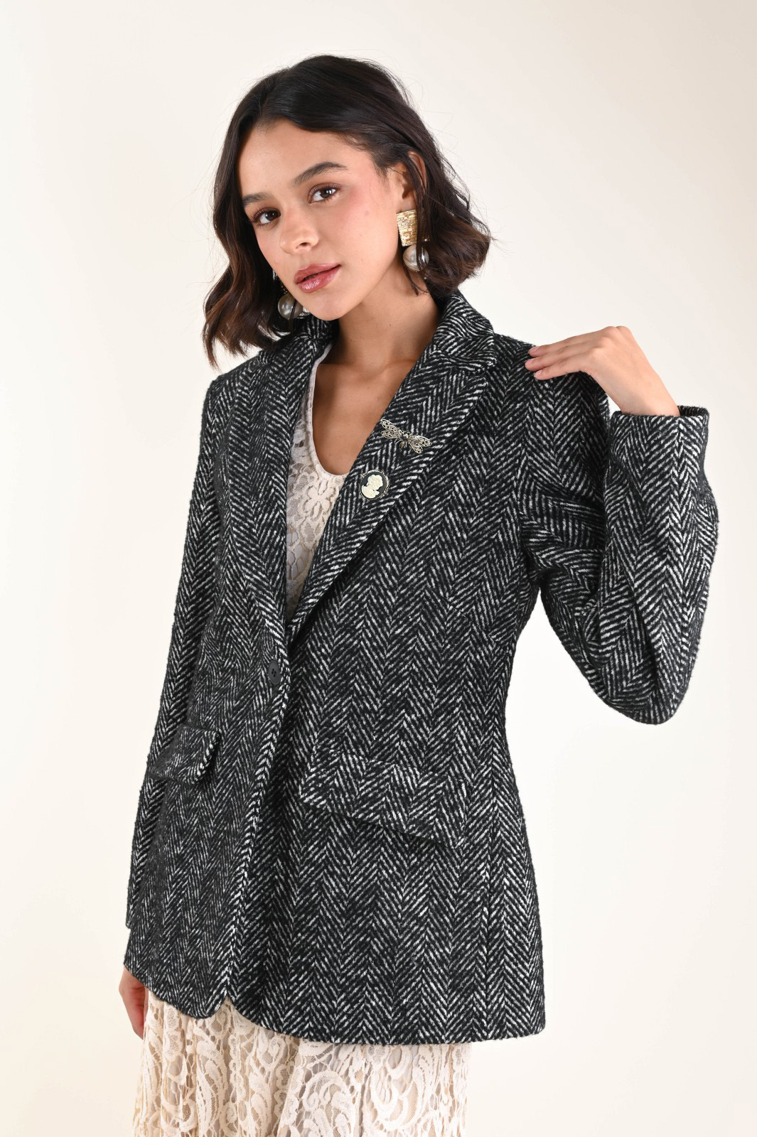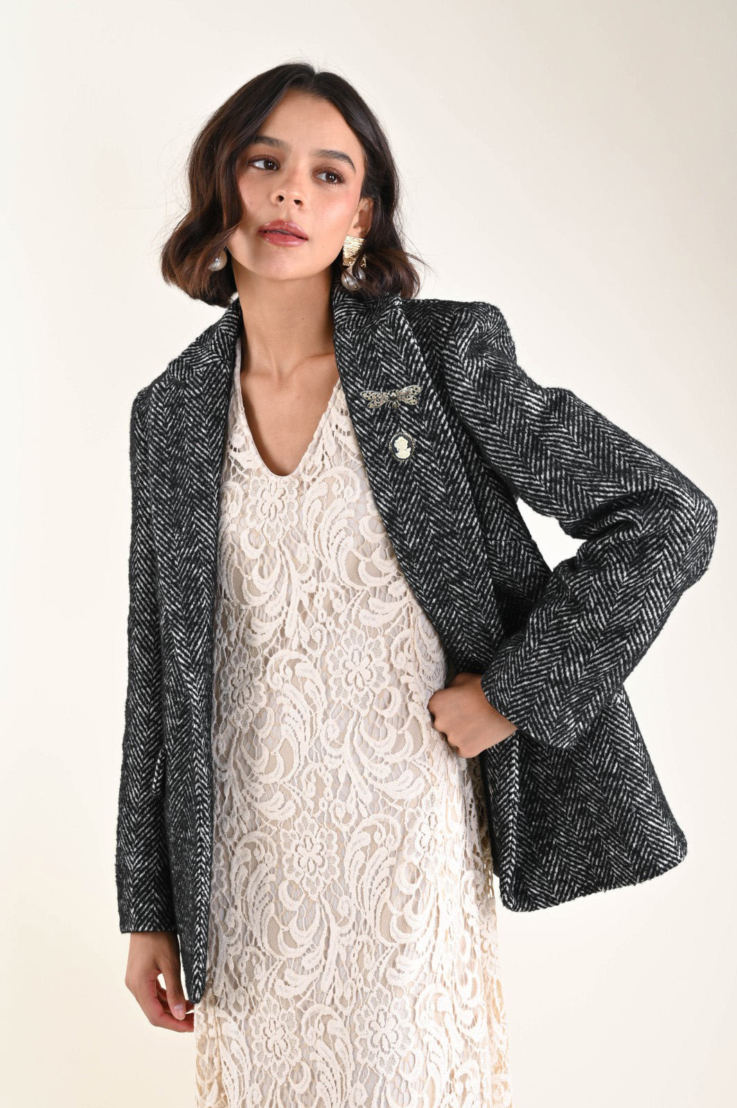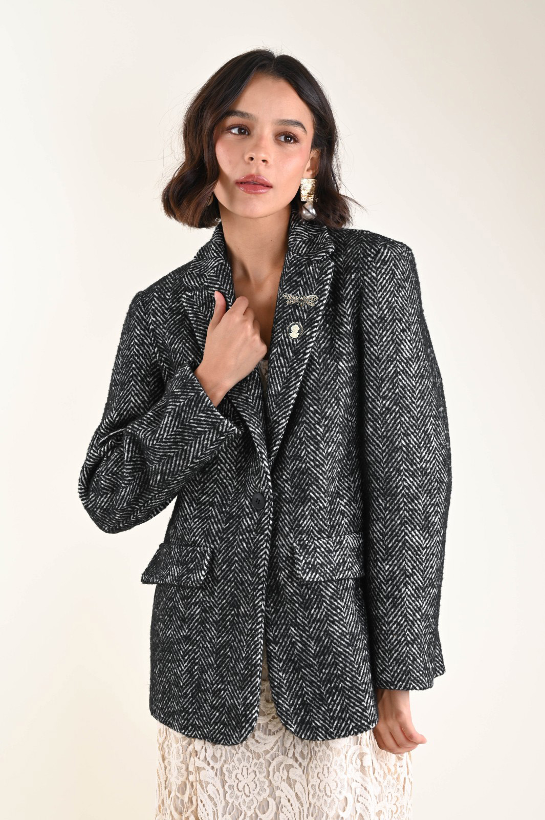 The Myastreet herringbone fabric blazer is an iconic piece that combines refinement and character. Crafted with an elegant texture and attention to detail, it features a feminine, structured silhouette that enhances the figure. Perfect to pair with its matching trousers or with casual pieces for a contemporary, on-trend look.