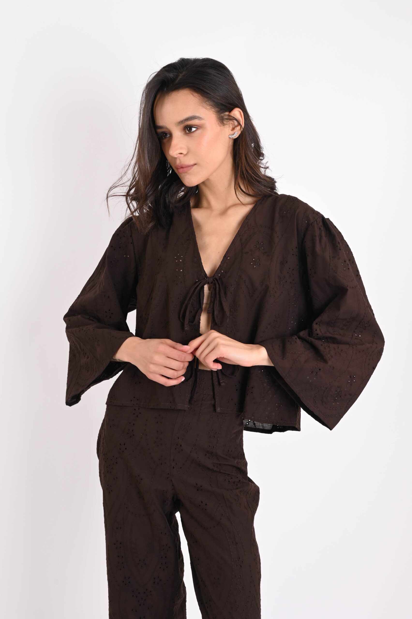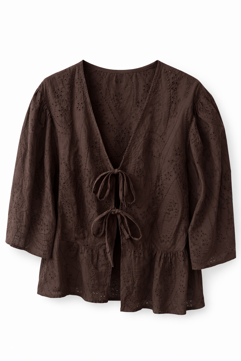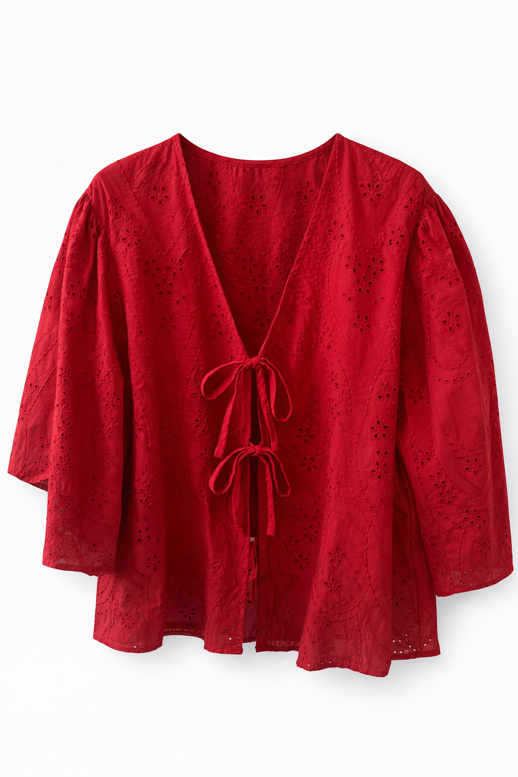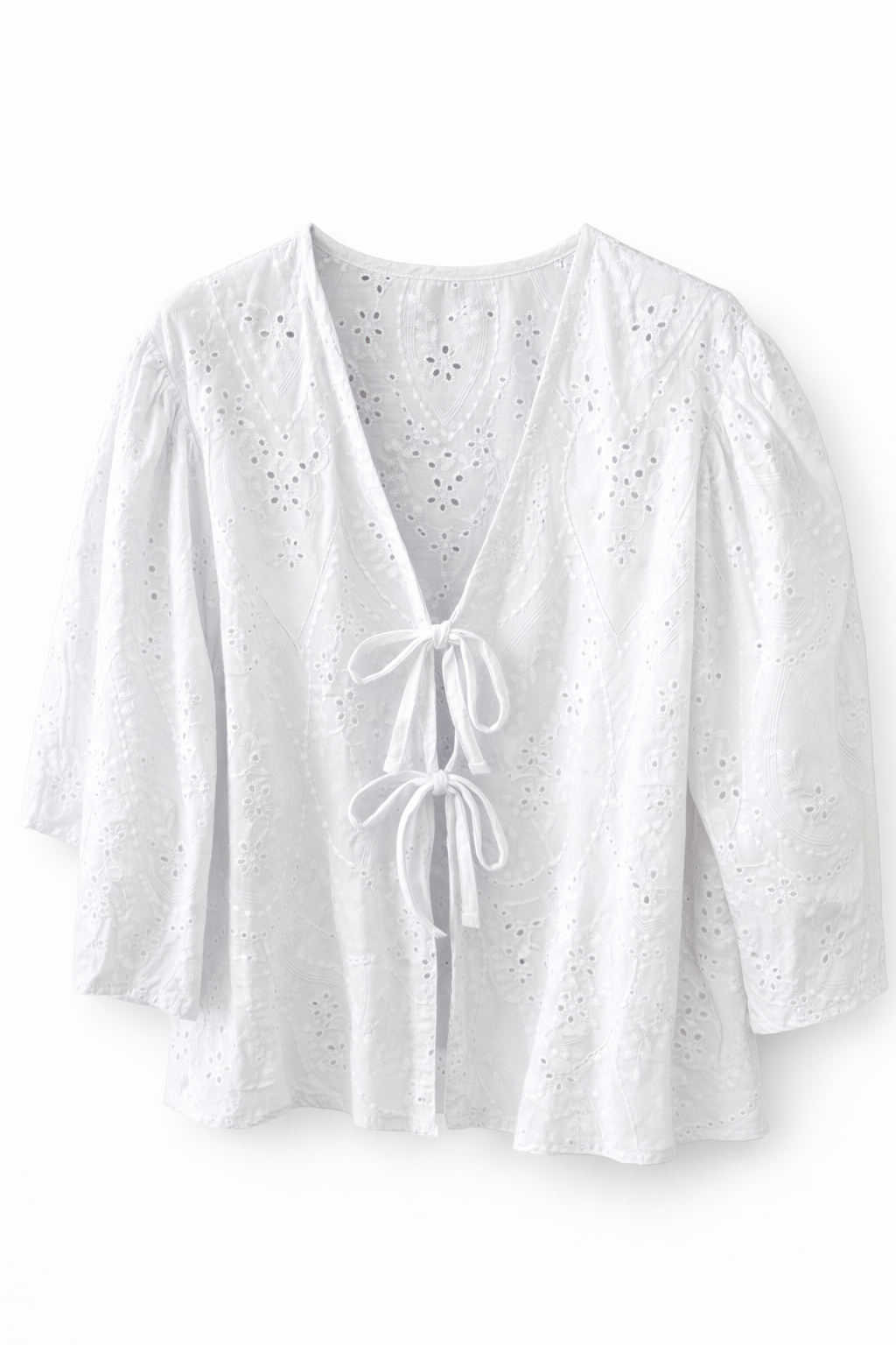 The front ties add a romantic and adjustable detail, allowing you to customize the fit and enhance the silhouette. The signature eyelet embroidery of broderie anglaise brings a refined and feminine touch, making this shirt perfect for casual chic looks or more elevated outfits.