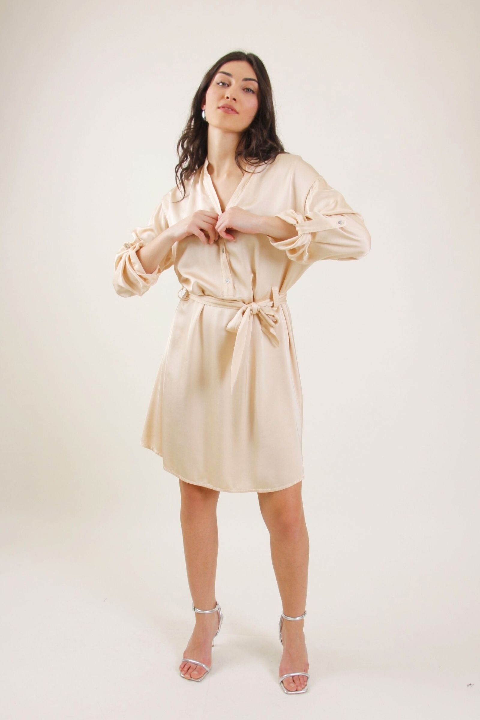 Shirt dress made from a lightweight and luminous viscose fabric. It features a fluid and relaxed line, with slightly voluminous long sleeves and fitted cuffs. The front closure is characterized by tone-on-tone buttons, while the collar is classic. The silhouette is enhanced by a matching belt at the waist, creating a wrapped and feminine effect. The length of the dress is short, ending above the knee.