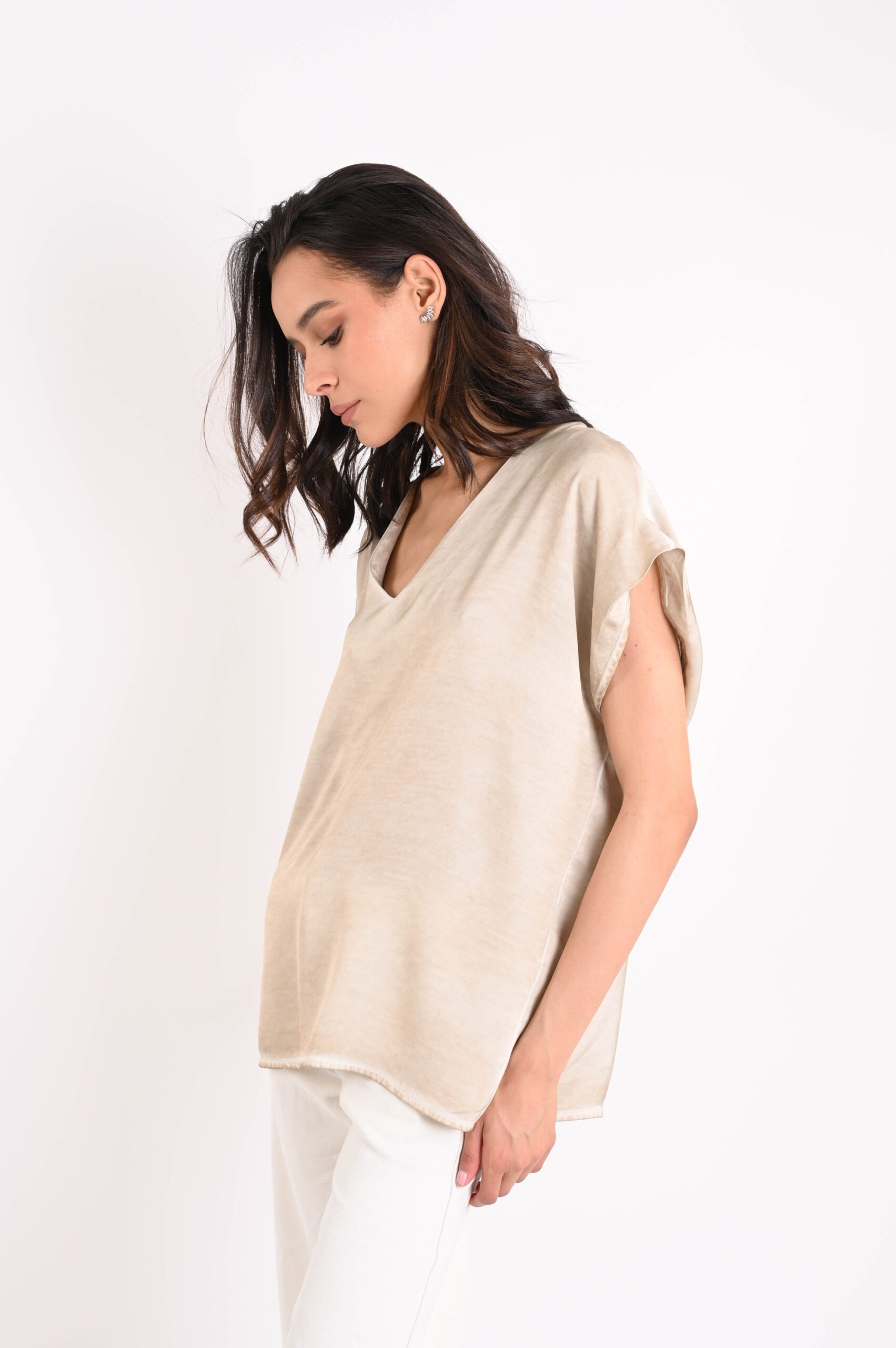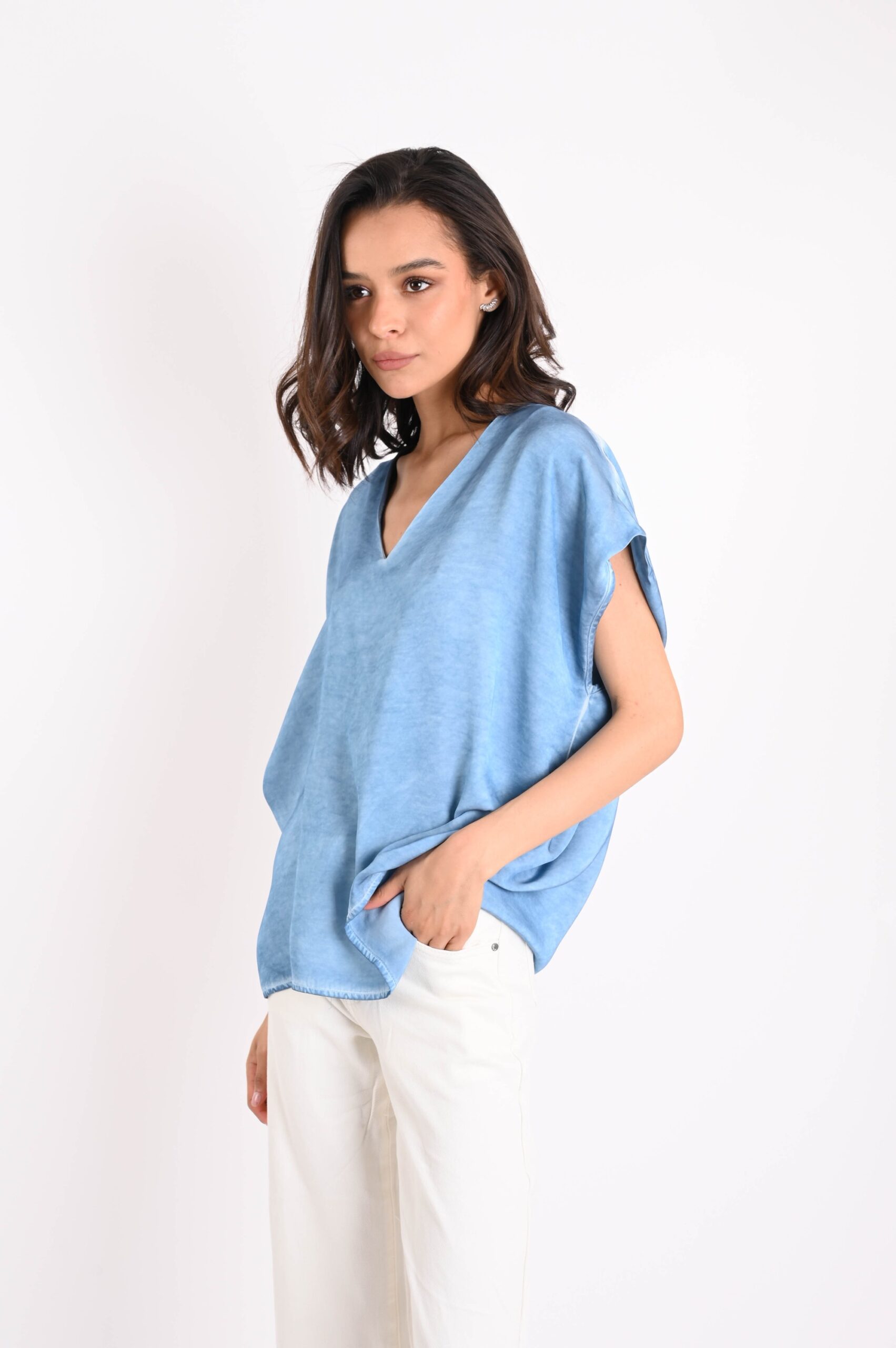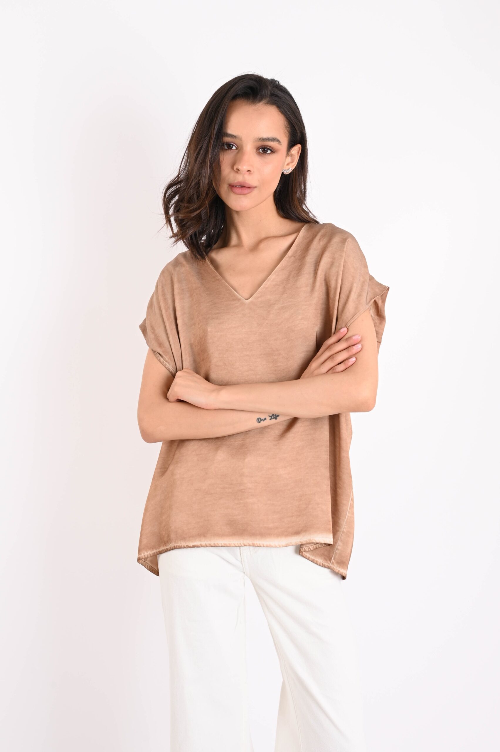 Discover the contemporary style of the cold-dyed V-neck blouse, a unique piece perfect for elevating your summer wardrobe. Crafted with a cold-dye treatment, this blouse stands out for its distinctive color effect, adding depth and character to the fabric.
