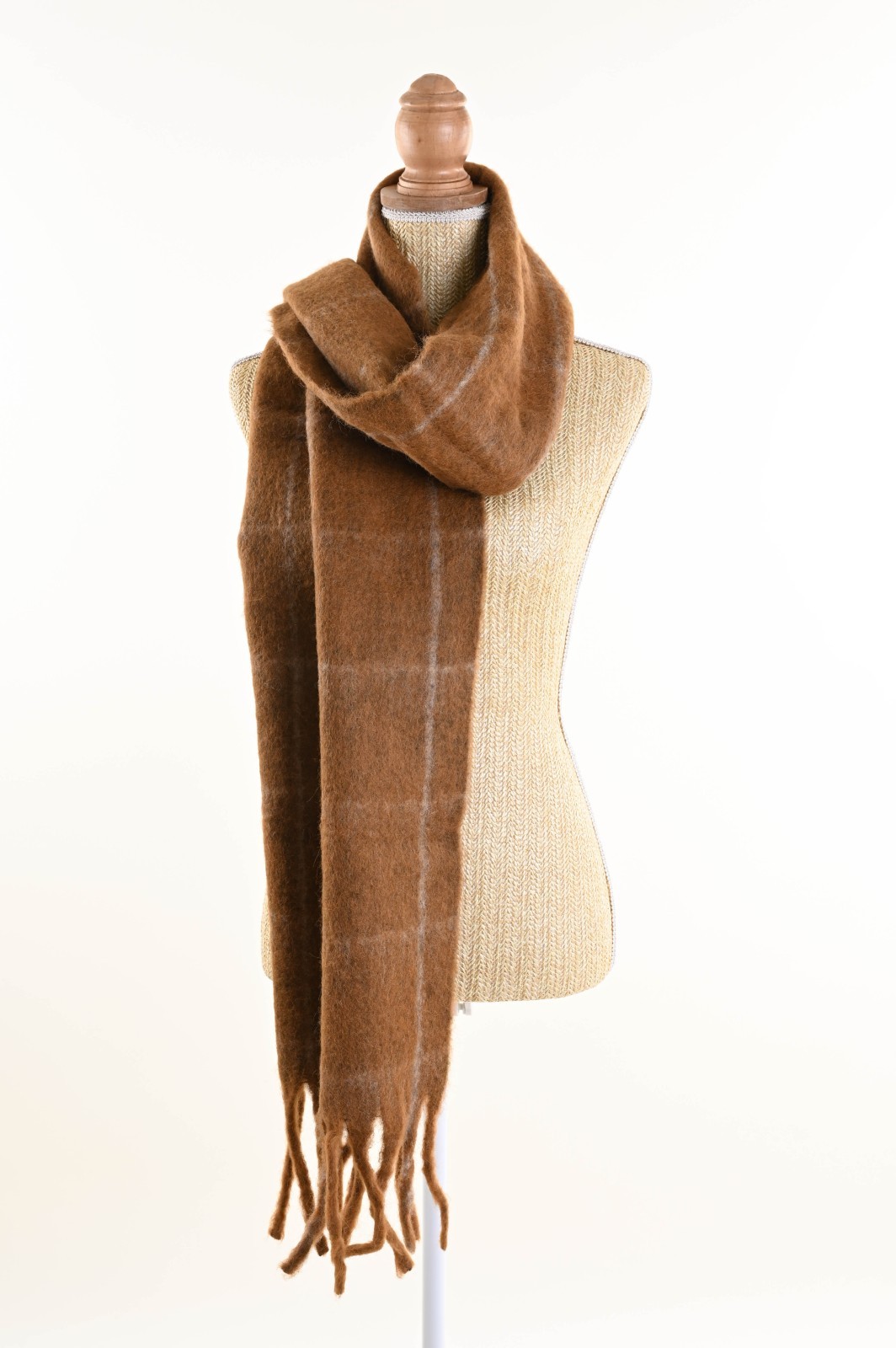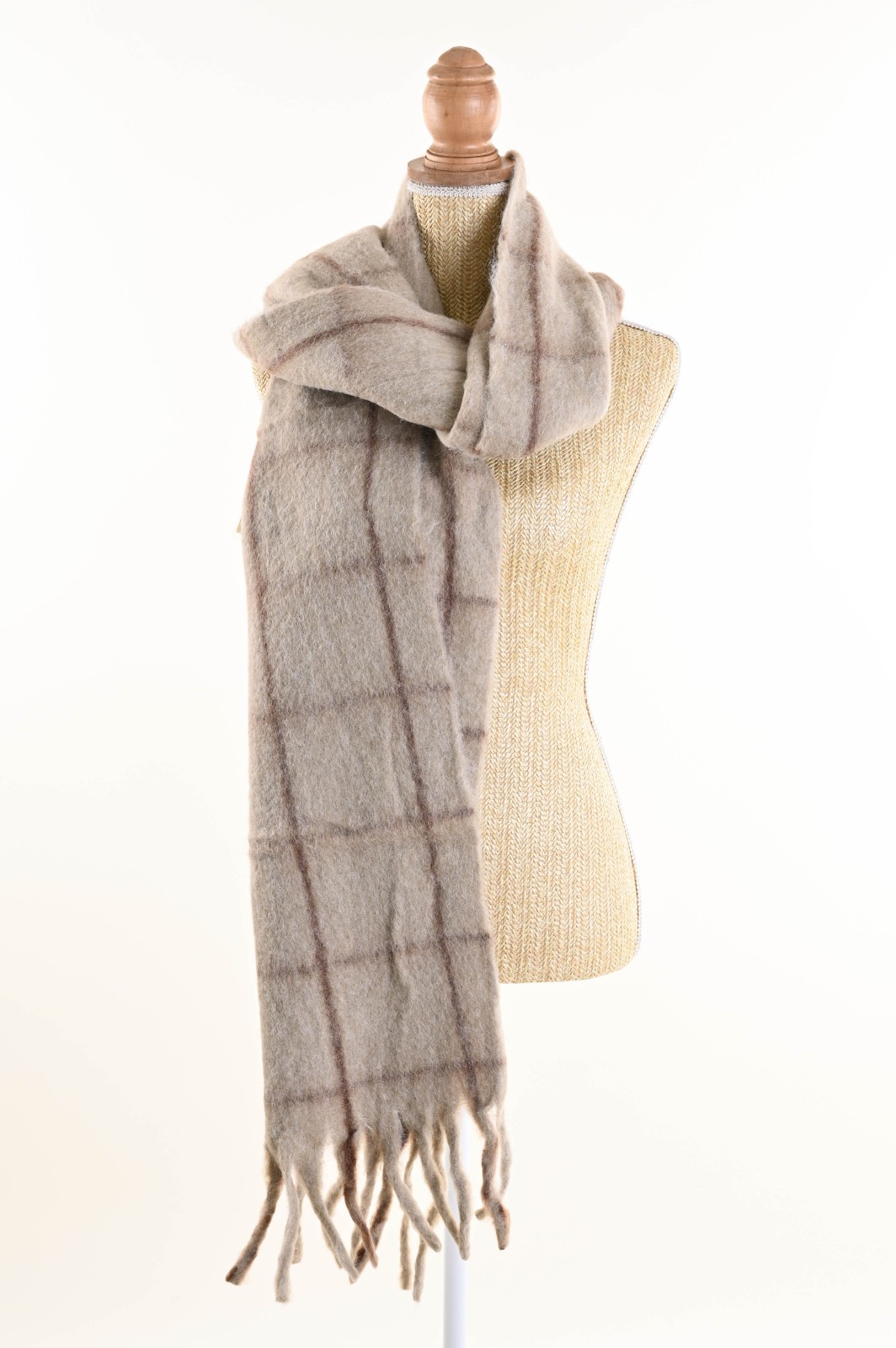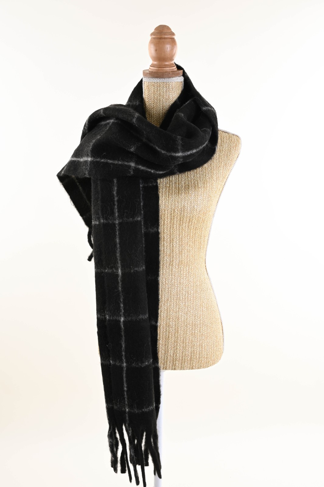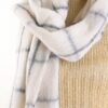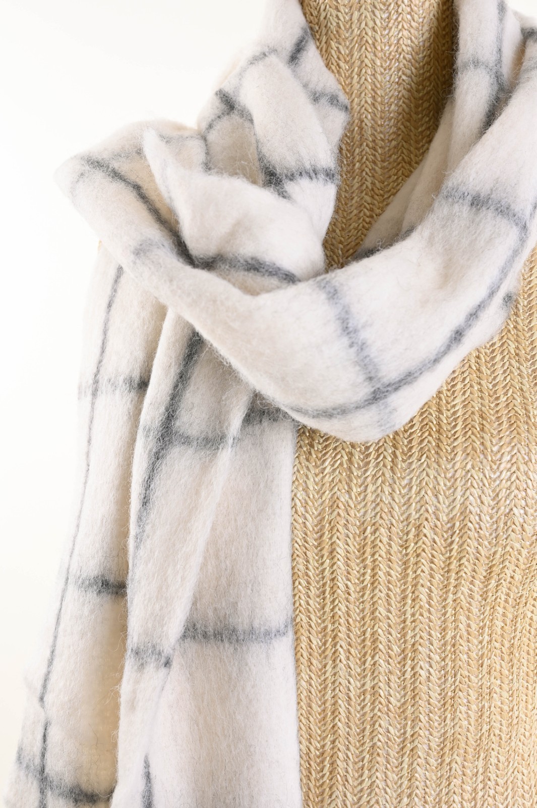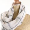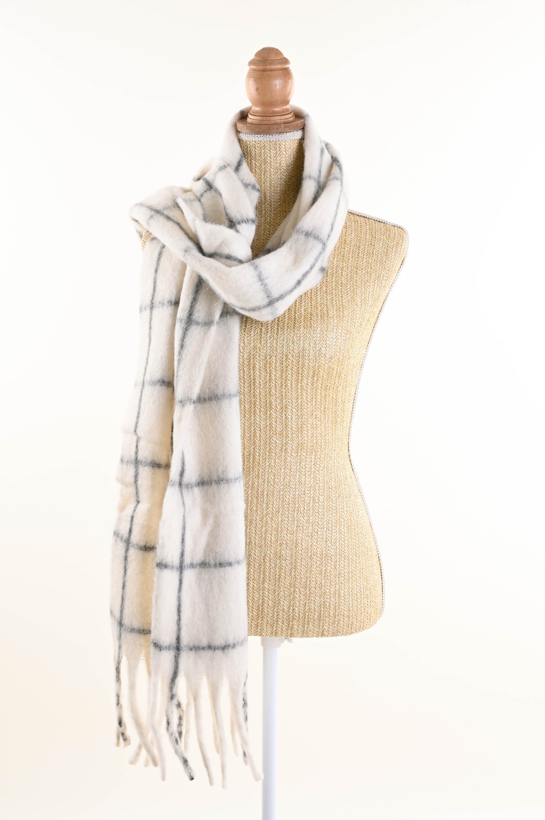 Soft scarf featuring a checked pattern and fringed edges, perfect for adding warmth and a refined touch to winter outfits. Its cozy and versatile design makes it an essential accessory to enhance your boutique’s seasonal selection.