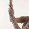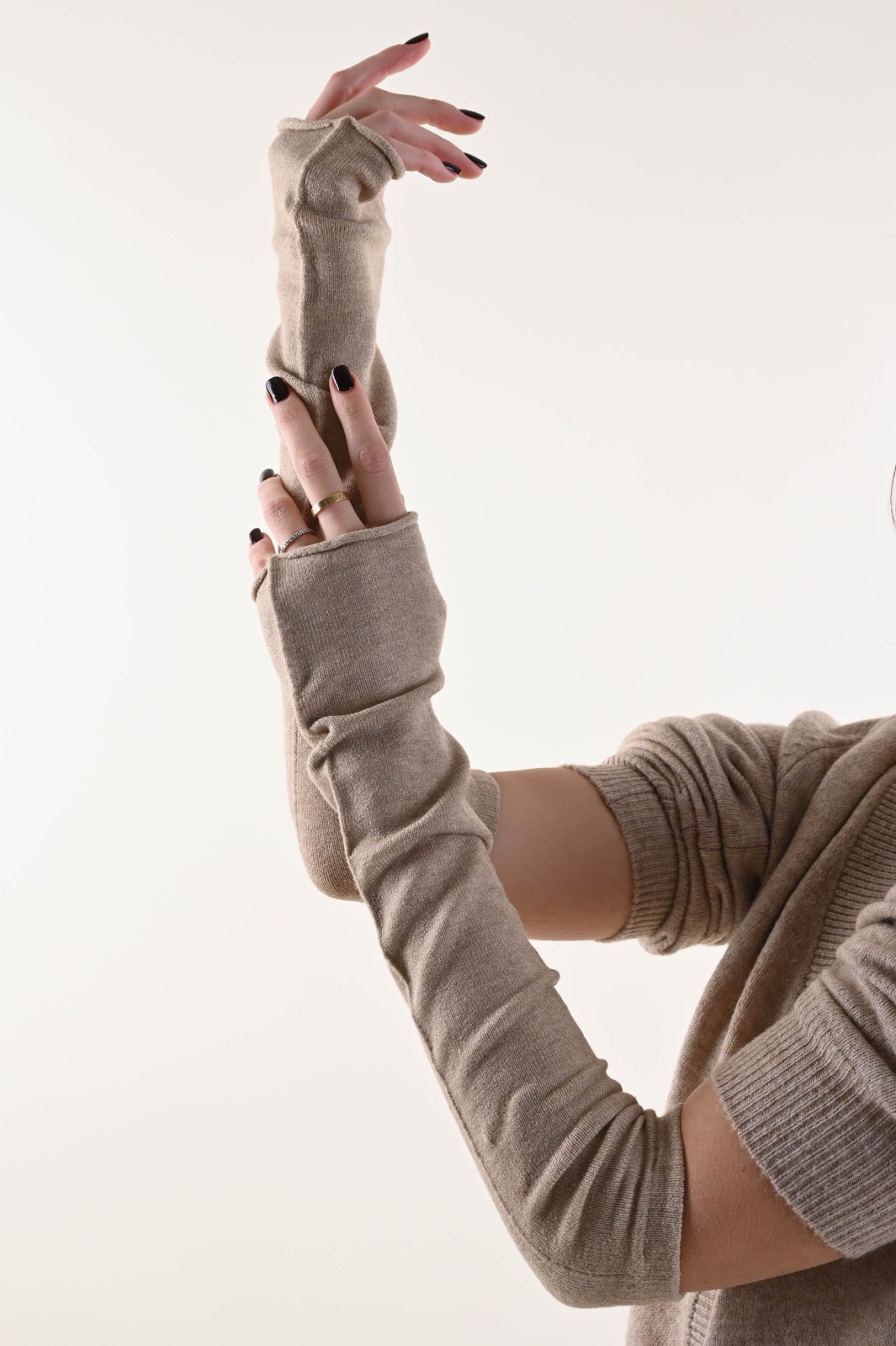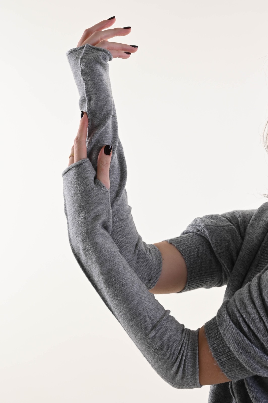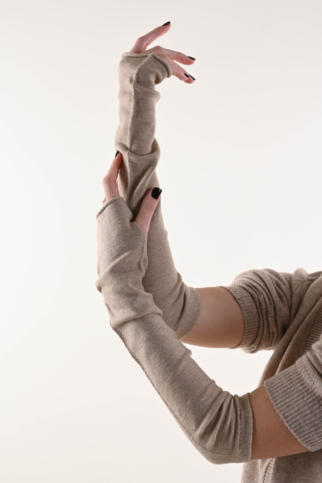 Long knit arm warmers with a soft, cozy design that adds warmth and style to winter looks. Their extended fit provides comfort and versatility, making them perfect for layering with both casual and refined outfits. A modern accessory boutiques can offer as a trendy and functional winter essential.