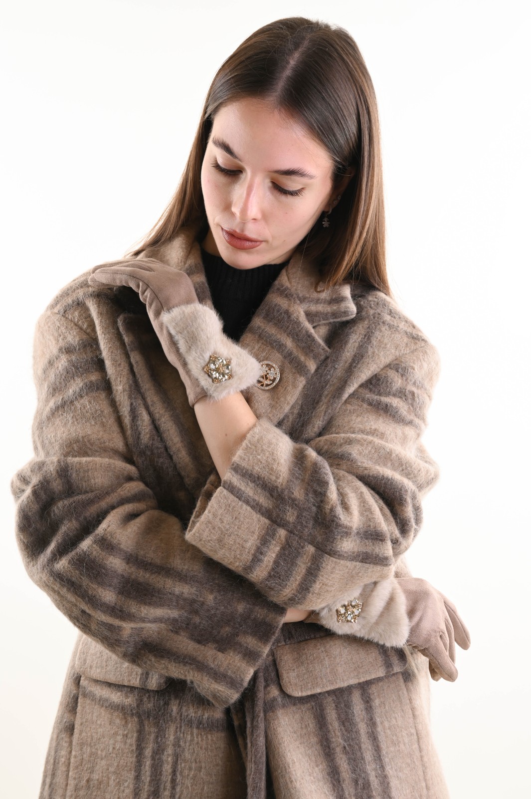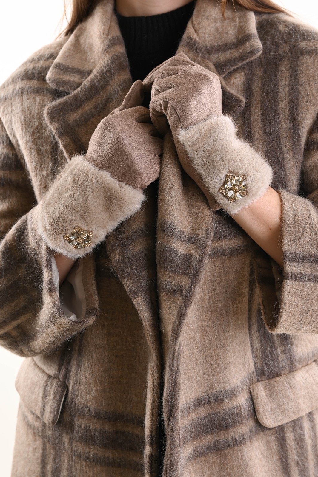 Myastreet gloves with faux fur trim and jewel detail are the perfect accessory to add a touch of sophistication to any winter look. Soft to the touch and warm to wear, they combine comfort and style for every occasion. The elegant design is enhanced by a sparkling jewel appliqué that adds light and refinement to the wrist, making these gloves ideal for both daytime and evening outfits.