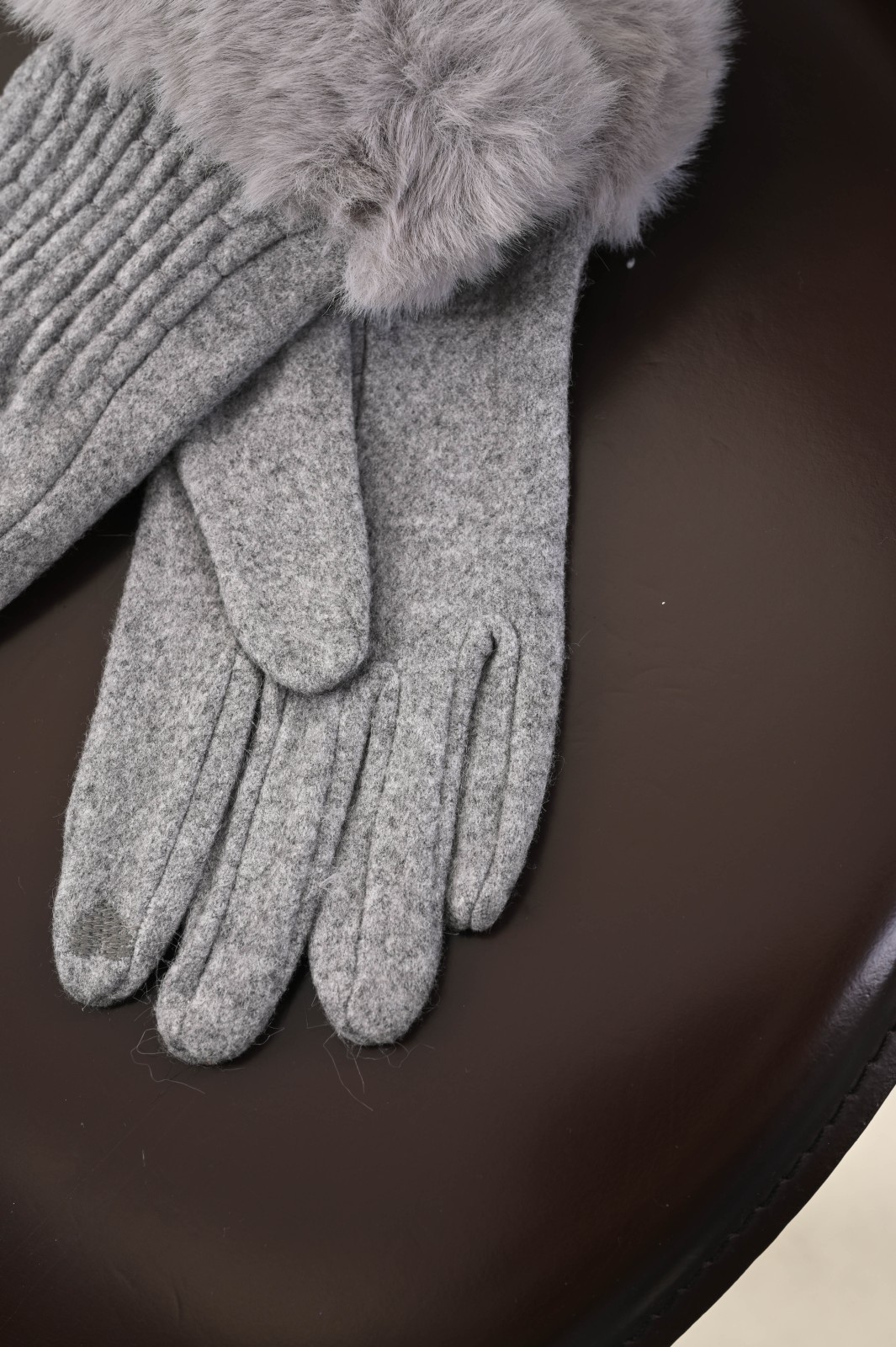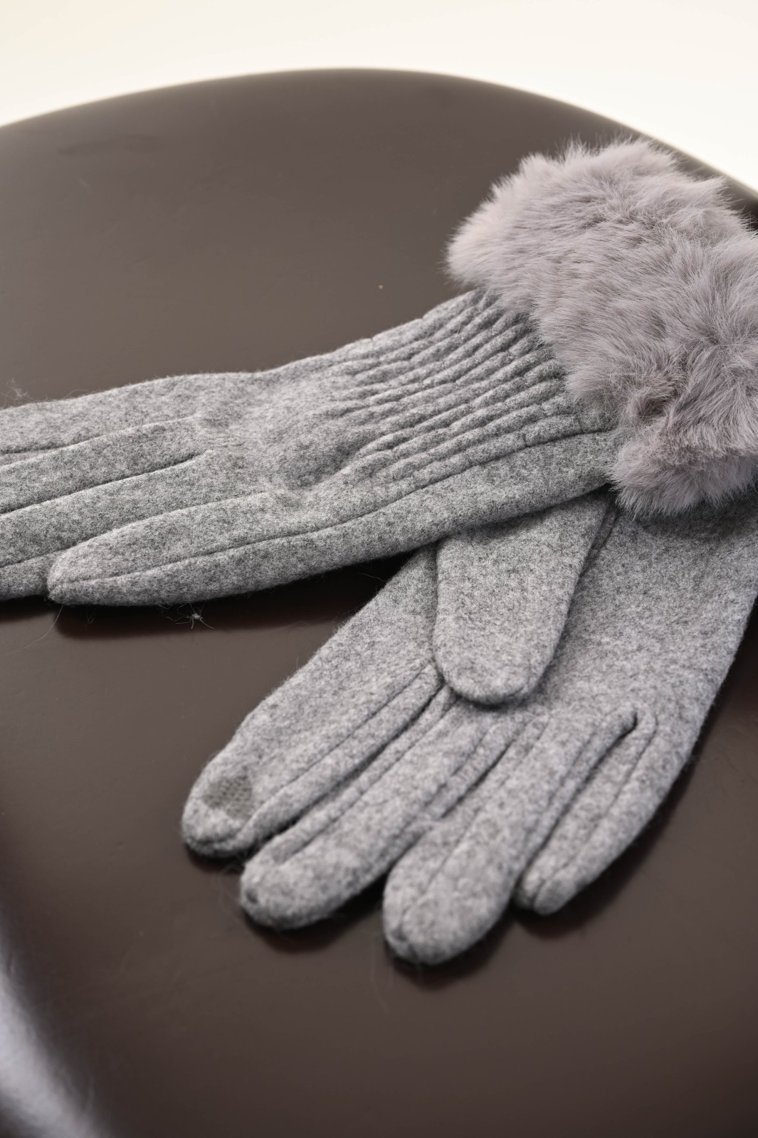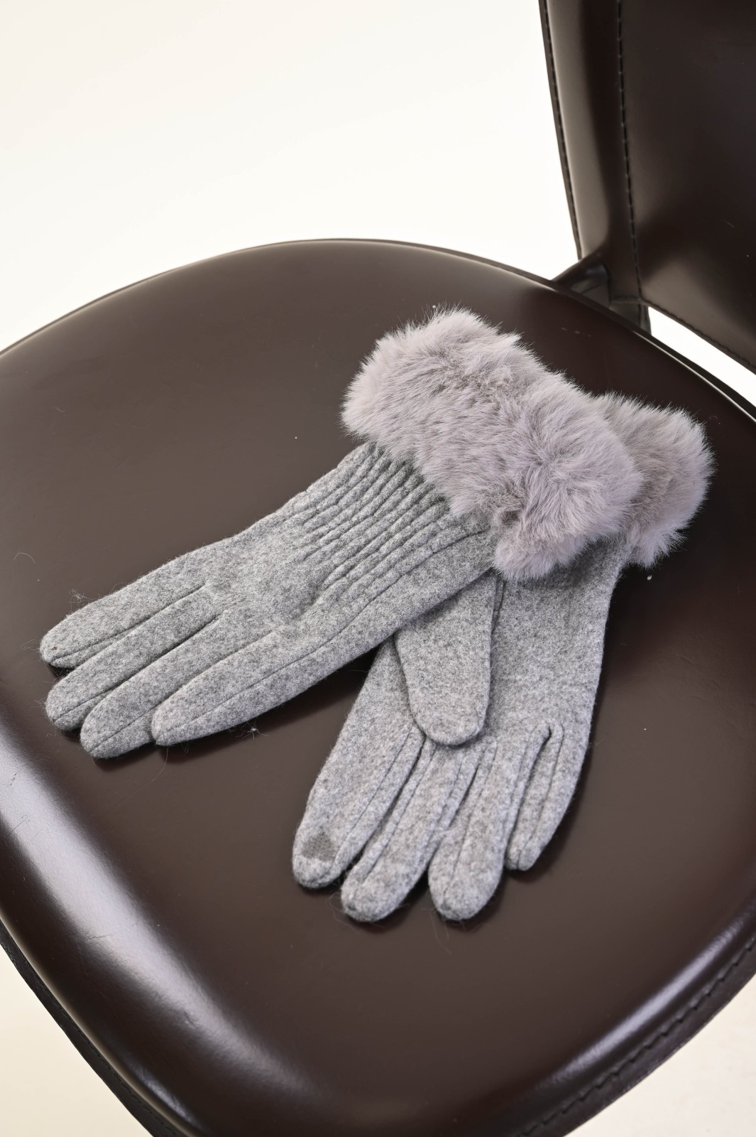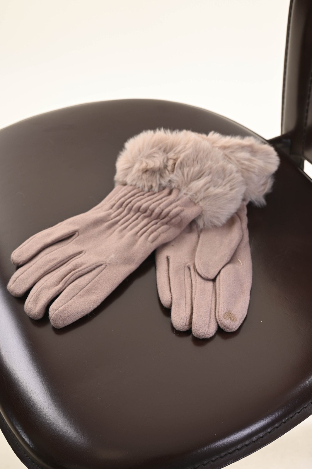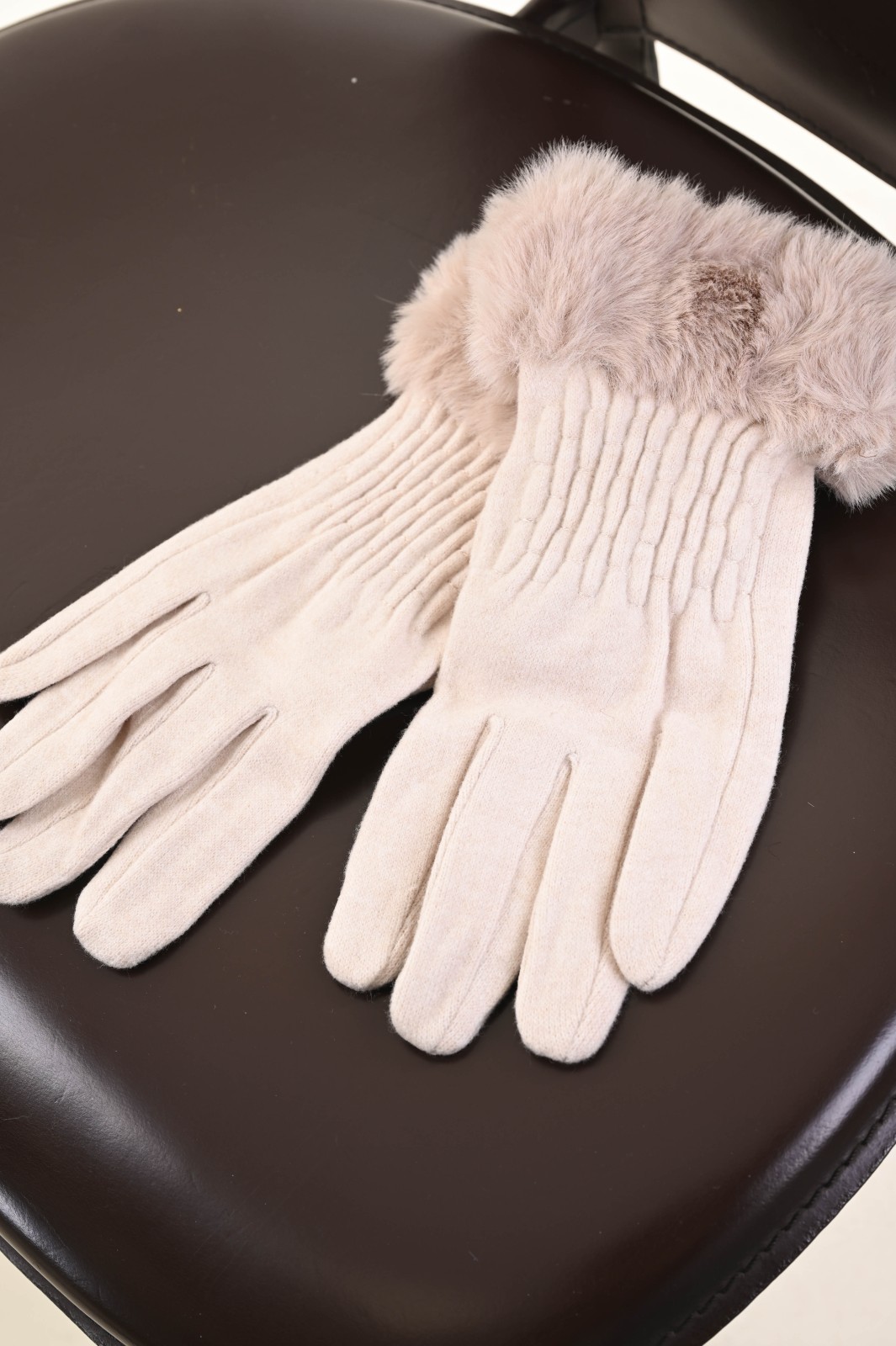 Soft gloves featuring a faux fur cuff that adds a warm and refined touch to the design. The slightly gathered detailing on the back provides a comfortable and feminine fit. A perfect accessory to enrich your boutique’s selection with an elegant and winter-ready option.