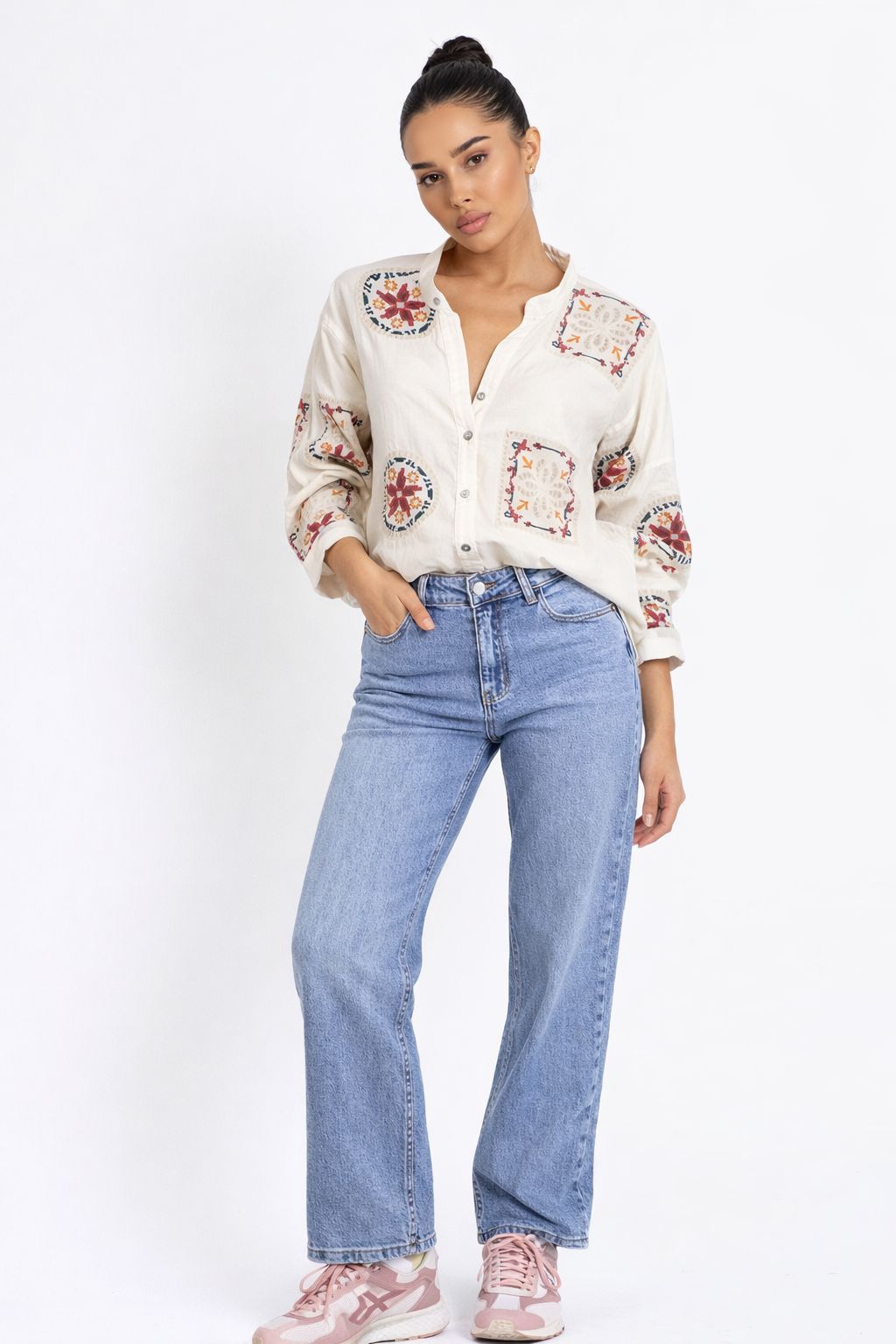 Flowy shirt enhanced with decorative embroidery that adds character and personality to the piece. The relaxed fit and clean silhouette make it perfect for contemporary boho chic looks, ideal for the summer season.