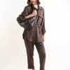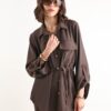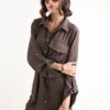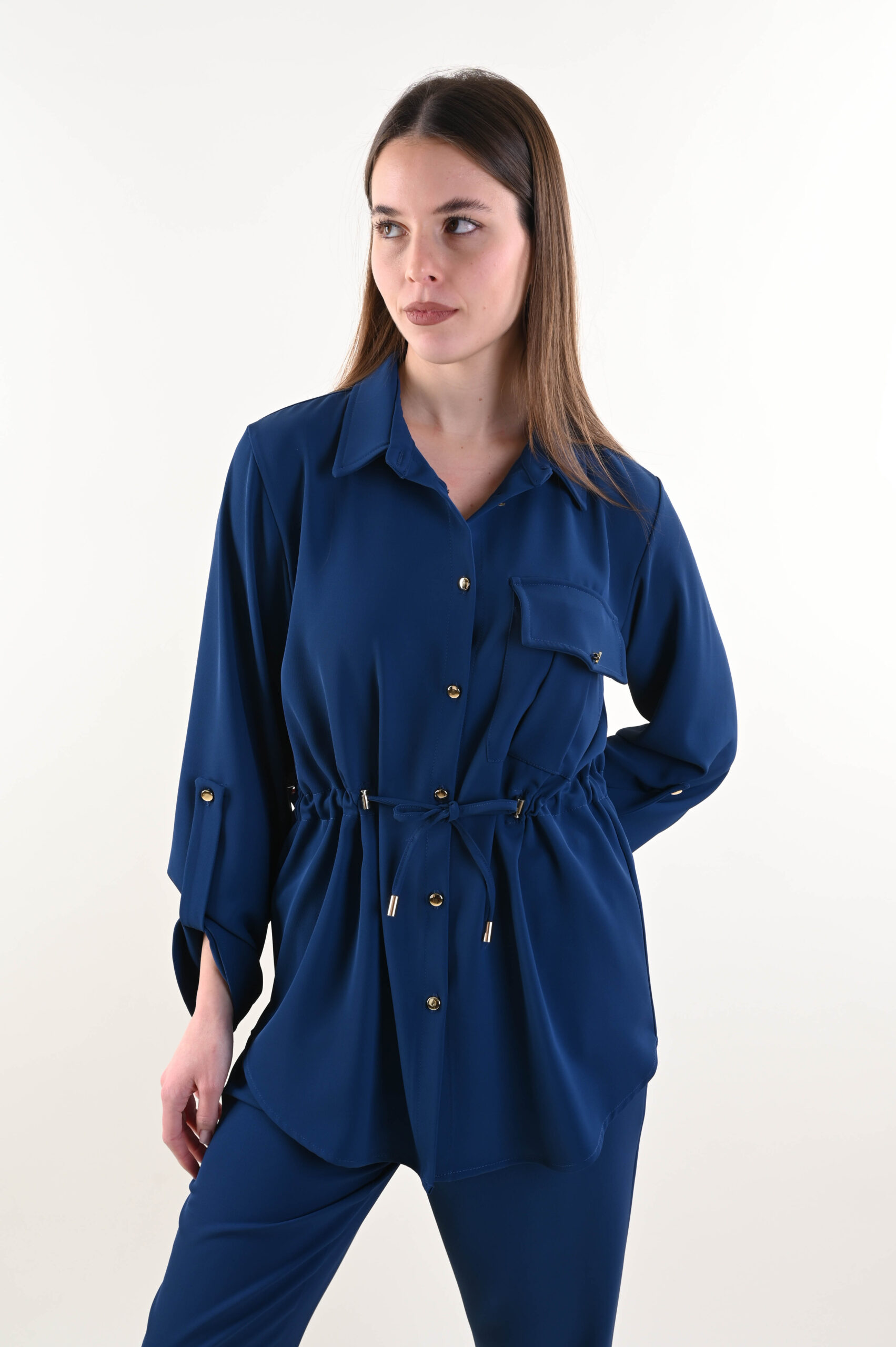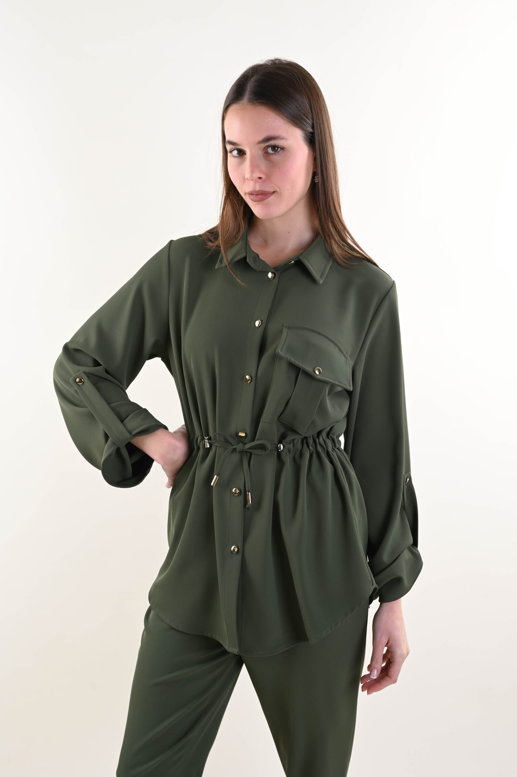 Women’s shirt with a bold and functional design, defined by a fluid silhouette and an adjustable drawstring at the waist that allows the fit to be customized while naturally enhancing the figure. The style features a classic collar, front button closure, and an applied chest pocket with a decorative button, details that create a perfect balance between utility style and contemporary femininity. Long sleeves with the option to roll them up complete this versatile piece, ideal for creating dynamic and polished looks.