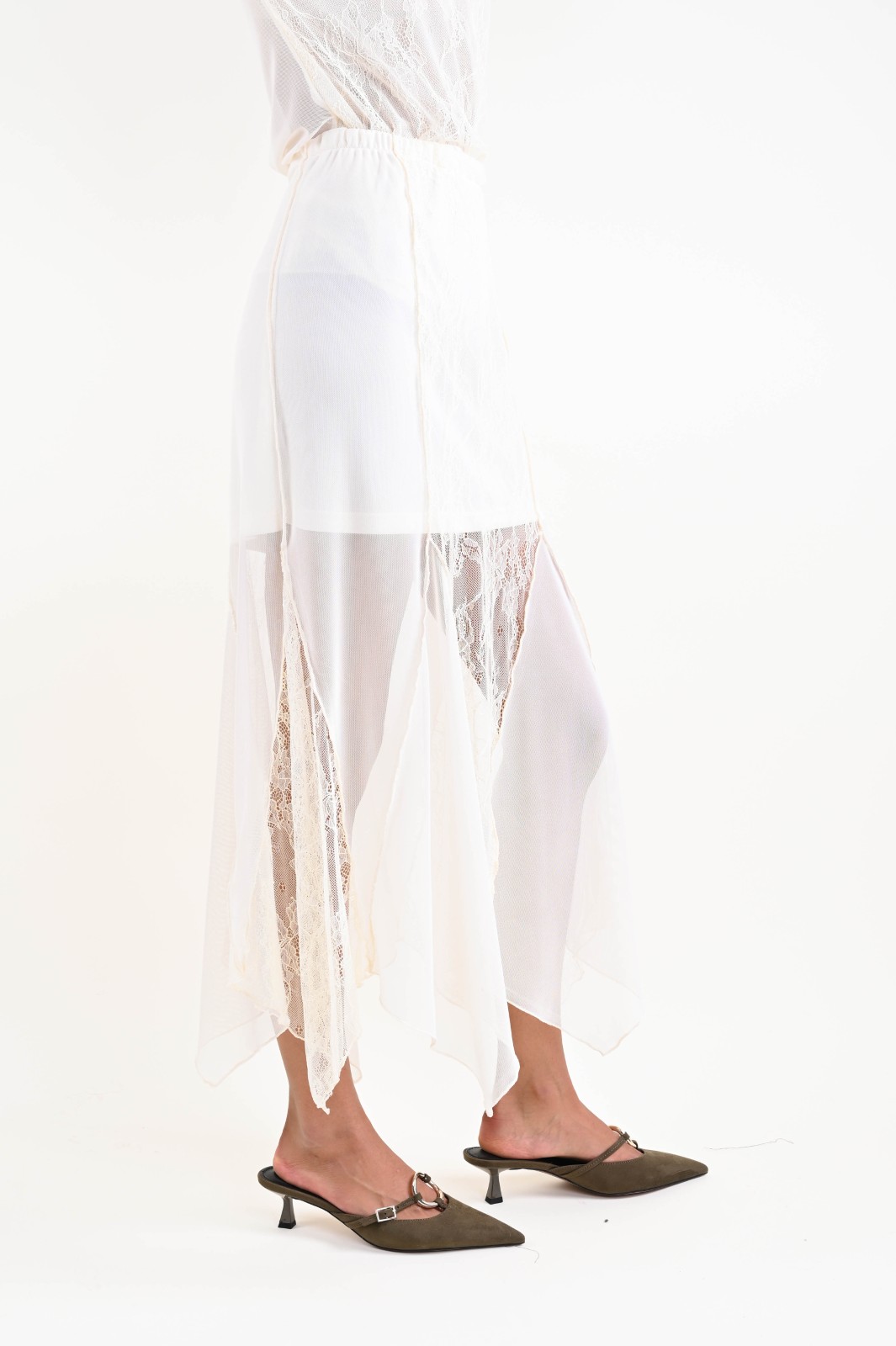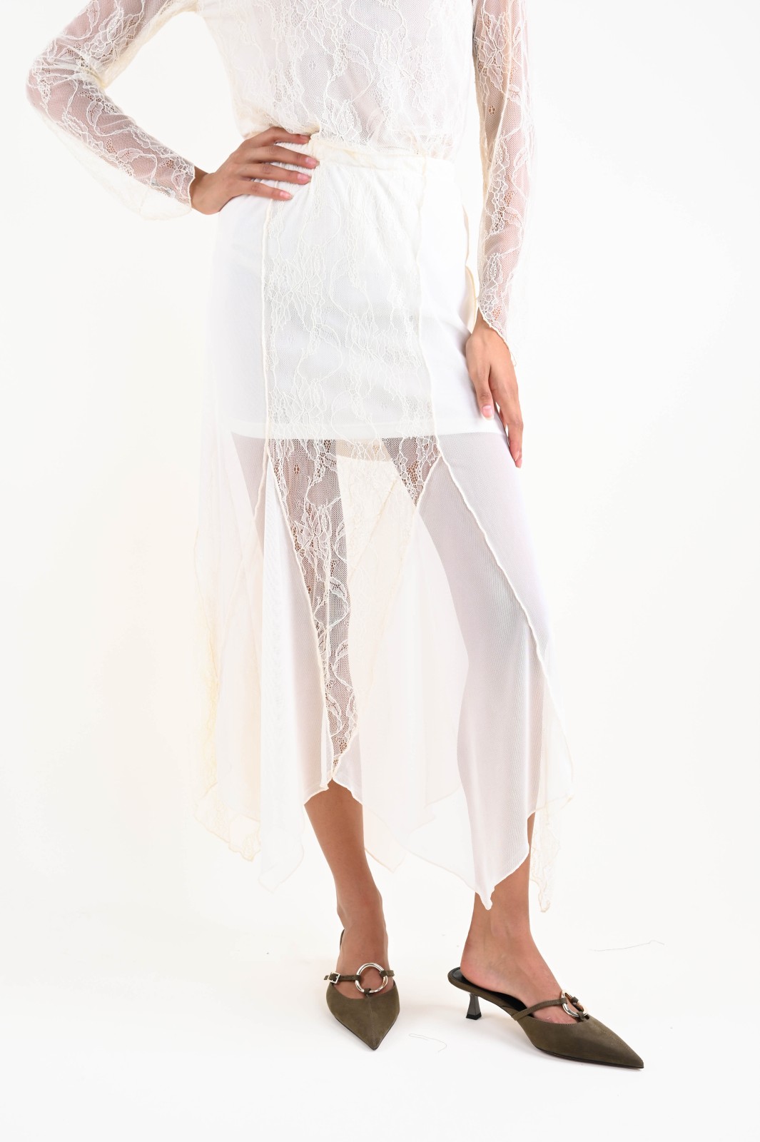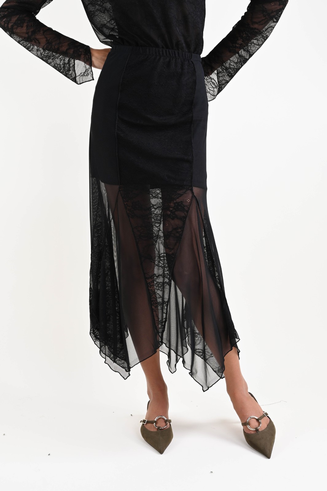 feminine and sophisticated piece designed to elevate any outfit with a touch of modern elegance. The lightness of tulle blends with the refinement of lace, creating delicate sheer effects that enhance the silhouette. Perfect to style with soft knitwear for a casual-chic look or with a blazer and top for special occasions. A versatile skirt that should not be missing from the wardrobe of those who love contemporary and refined style.