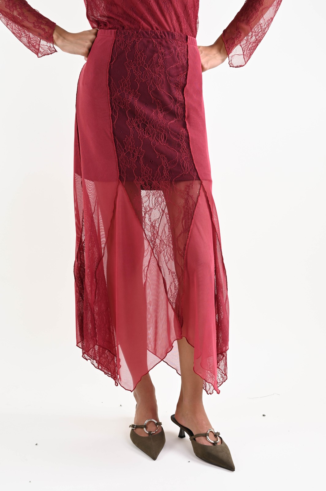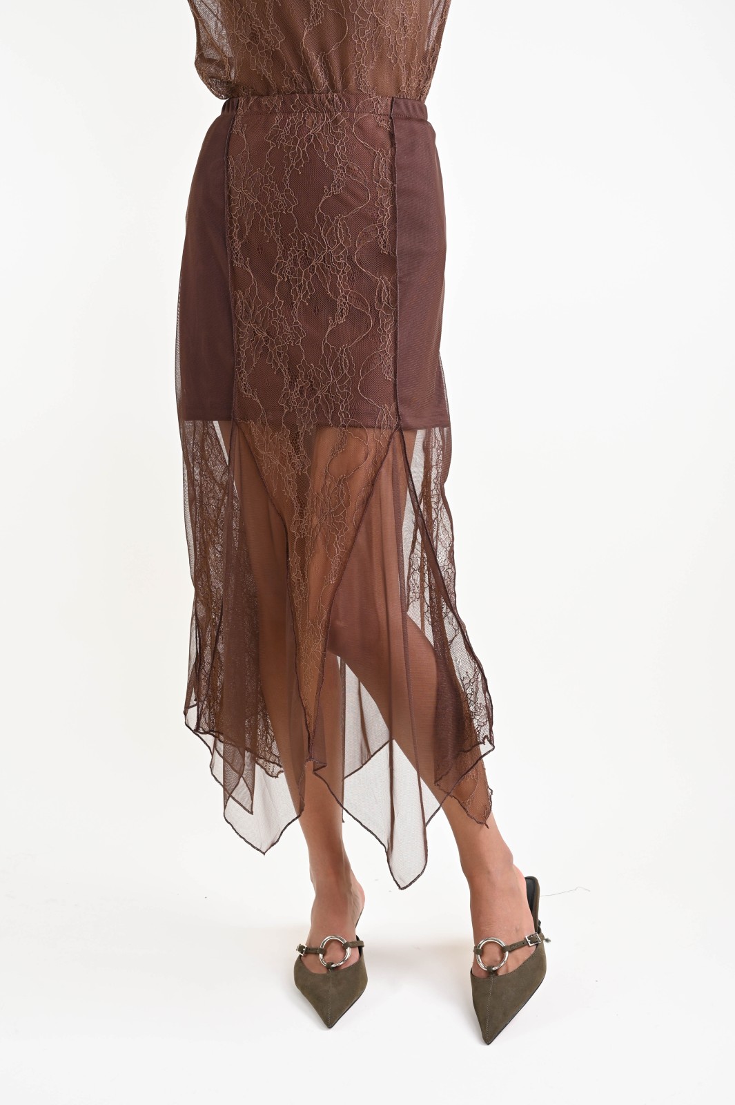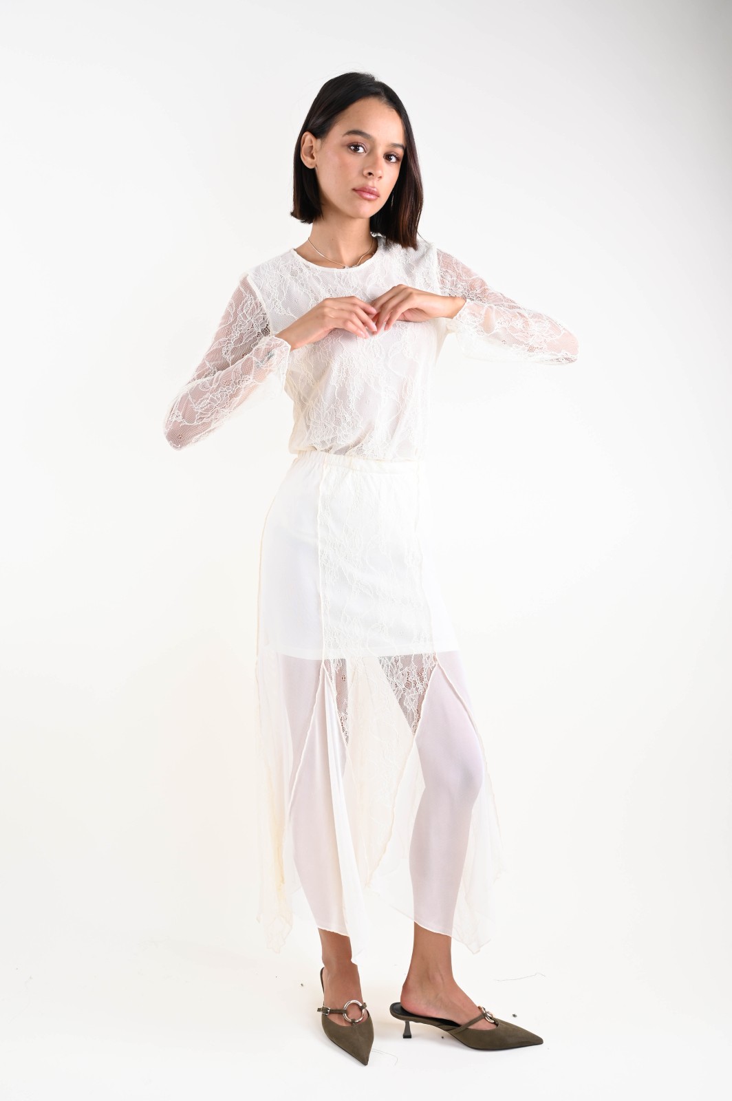 feminine and sophisticated piece designed to elevate any outfit with a touch of modern elegance. The lightness of tulle blends with the refinement of lace, creating delicate sheer effects that enhance the silhouette. Perfect to style with soft knitwear for a casual-chic look or with a blazer and top for special occasions. A versatile skirt that should not be missing from the wardrobe of those who love contemporary and refined style.
