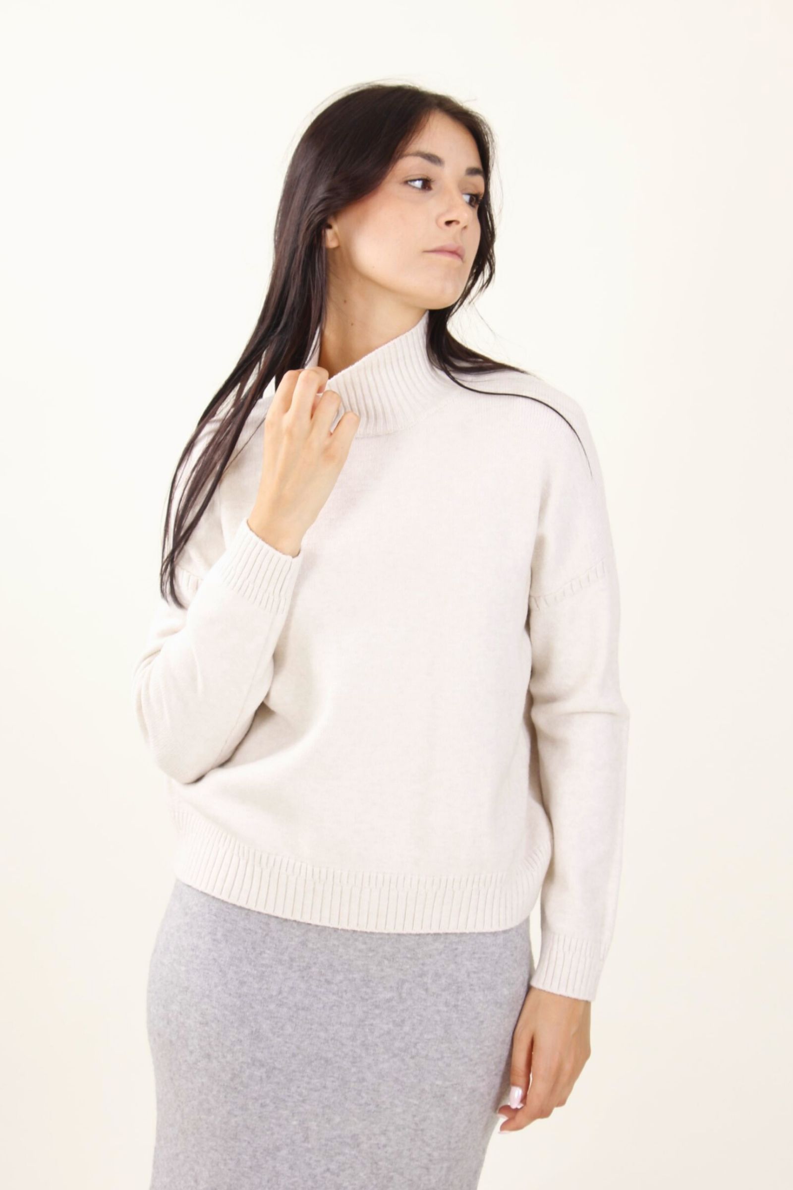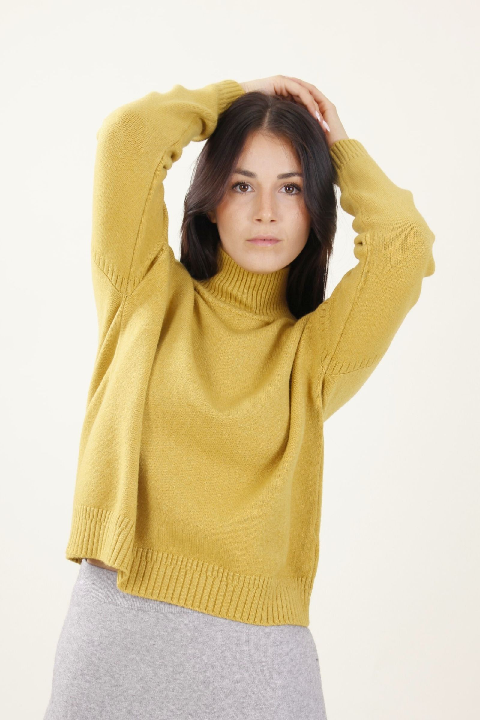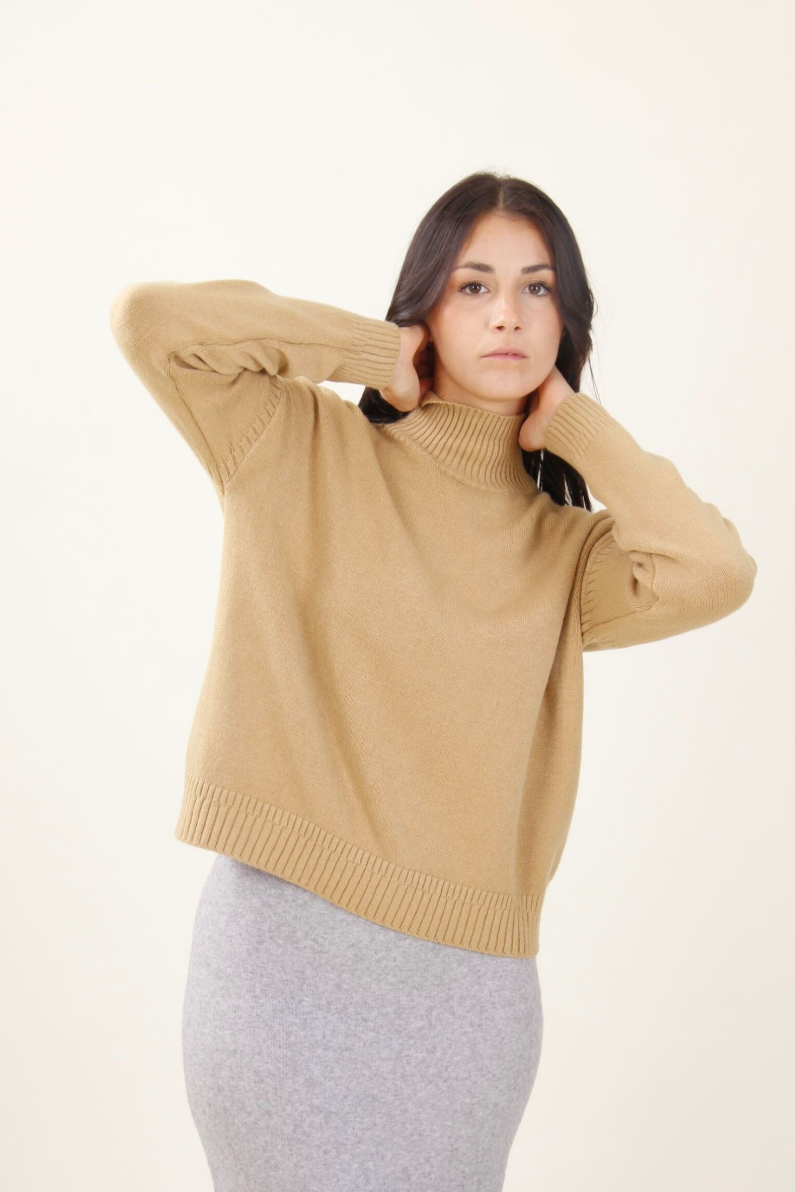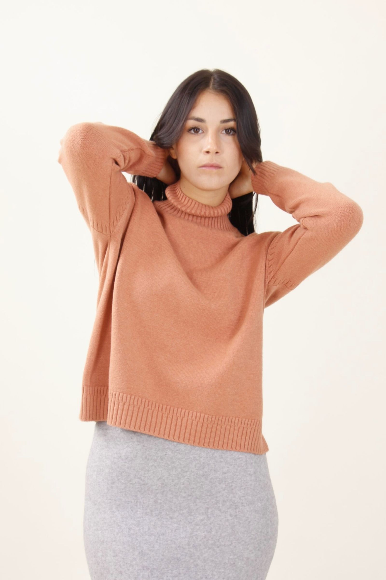 Turtleneck sweater with neck, cuffs and ribbed bottom. Finished at the sleeve. Slightly over fit.
