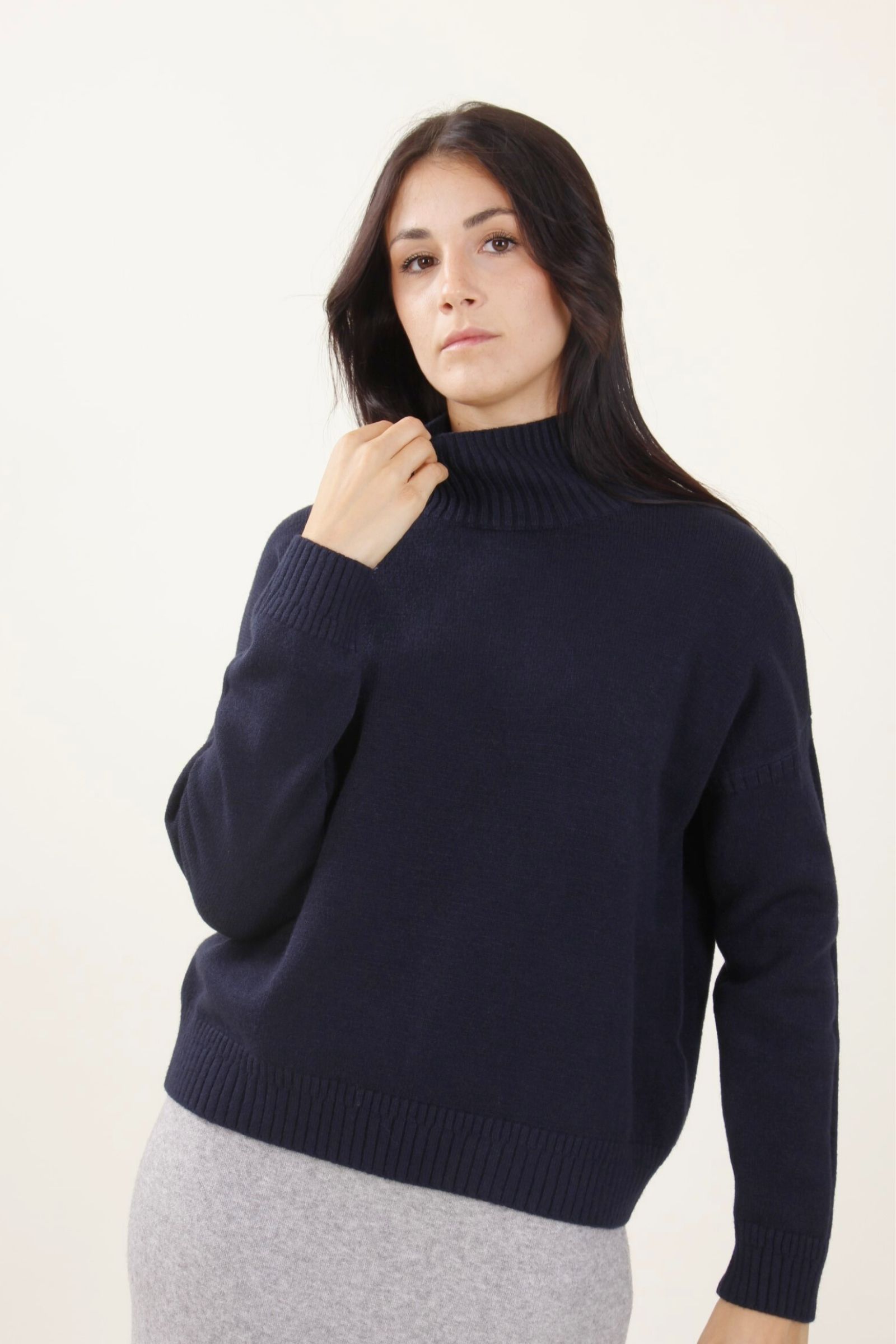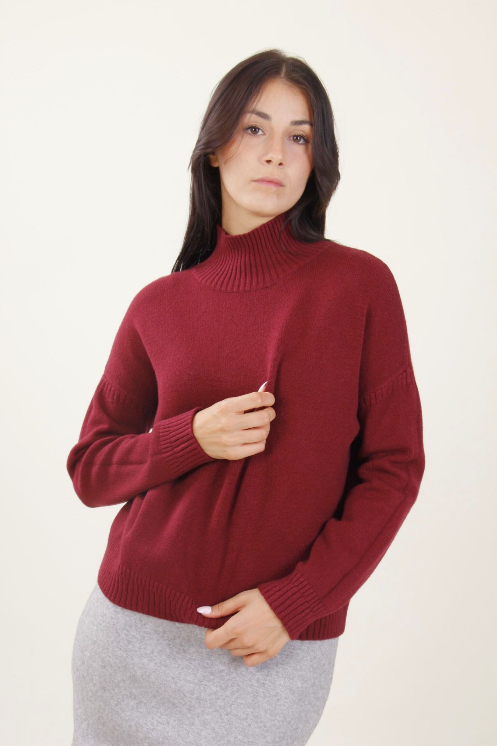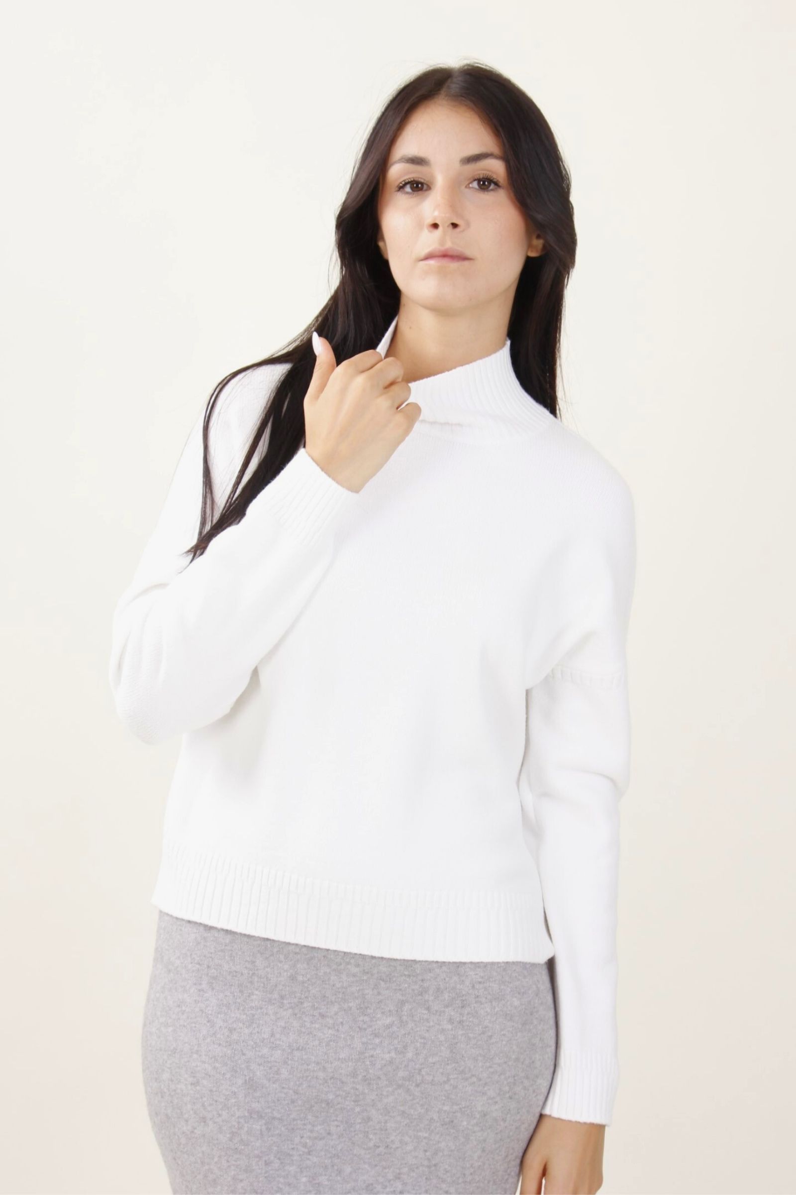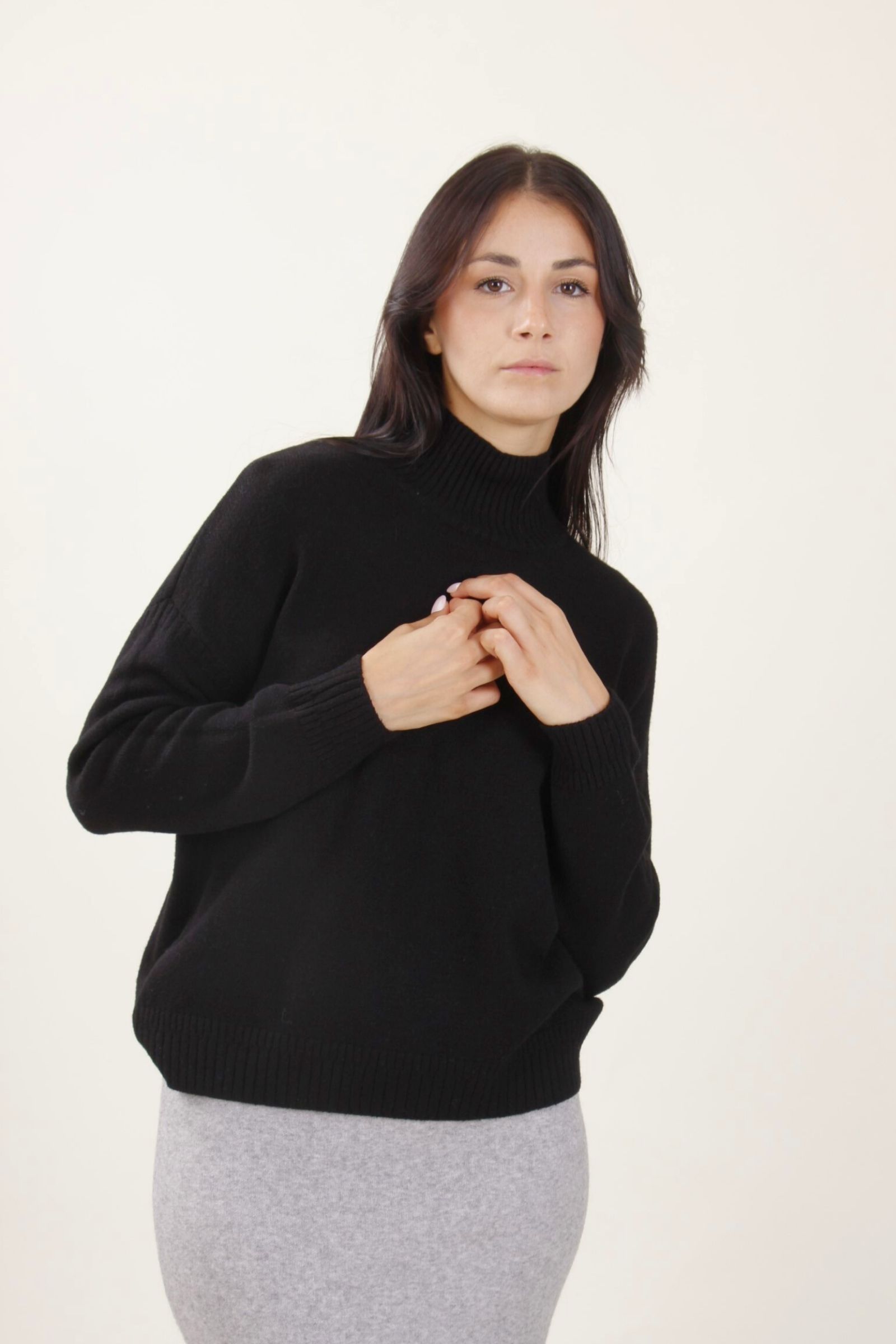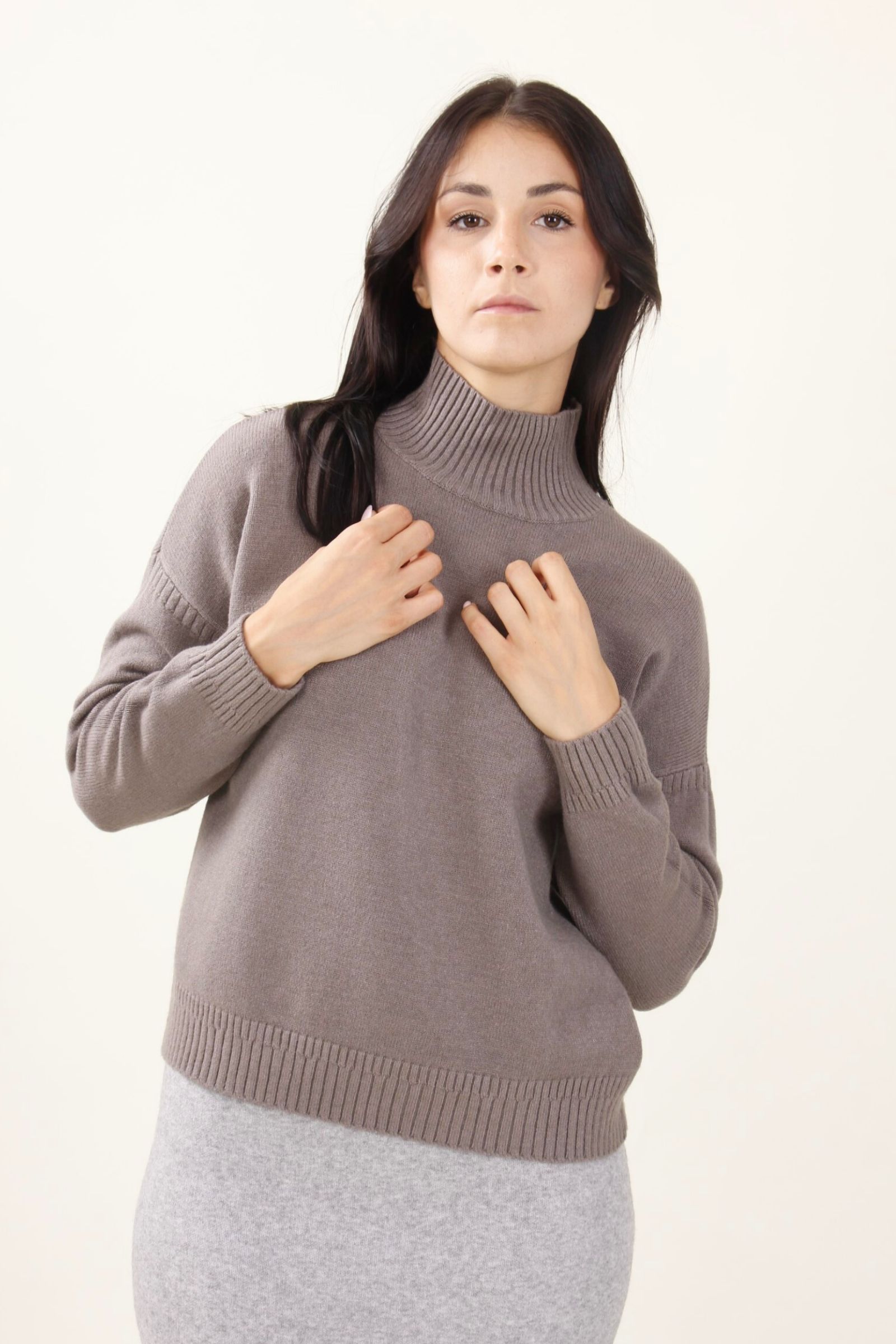 Turtleneck sweater with neck, cuffs and ribbed bottom. Finished at the sleeve. Slightly over fit.